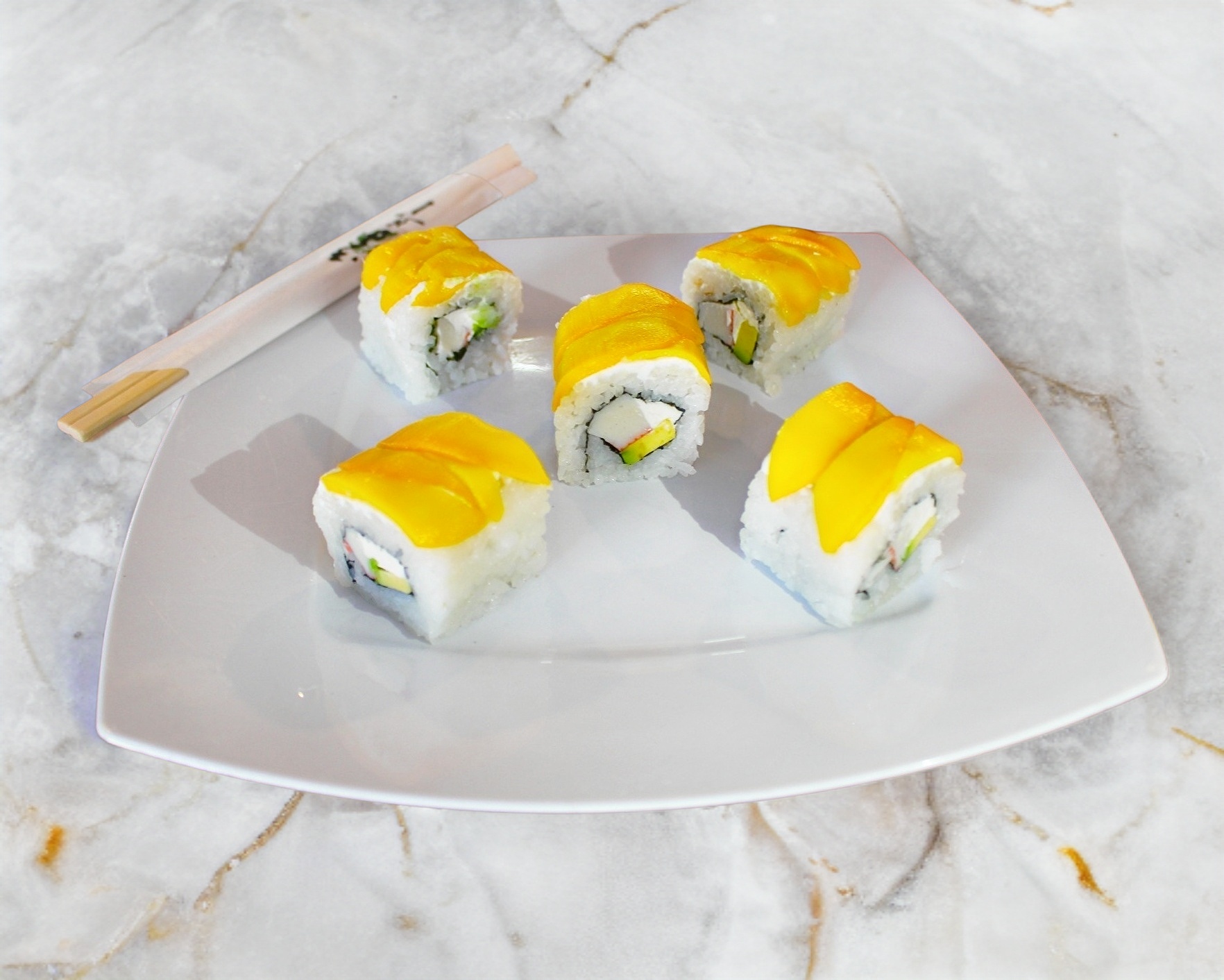 Por fuera mango; por dentro cangrejo, aguacate y Philadelphia.