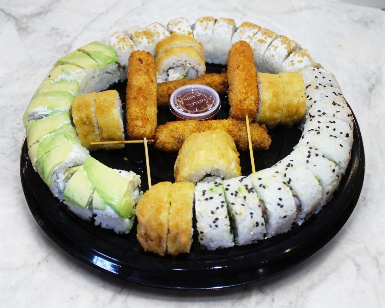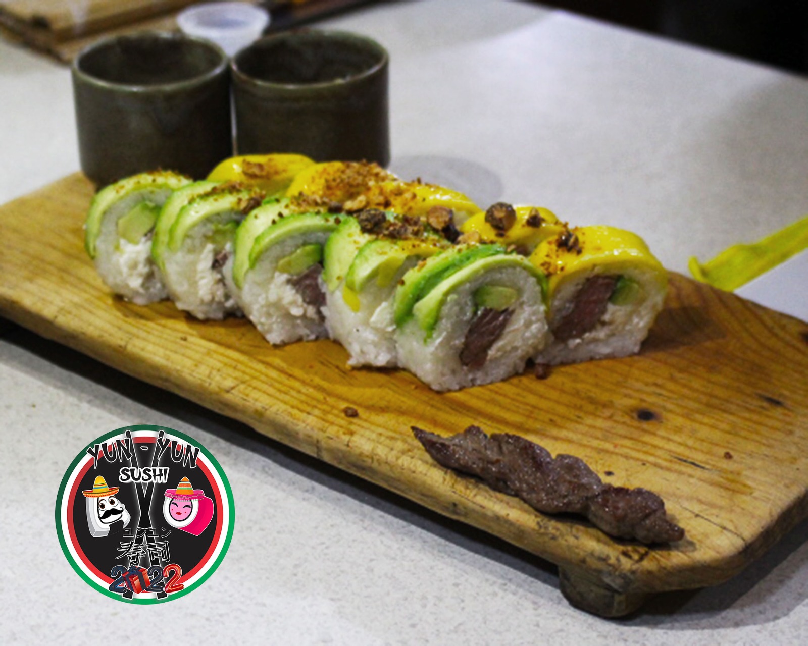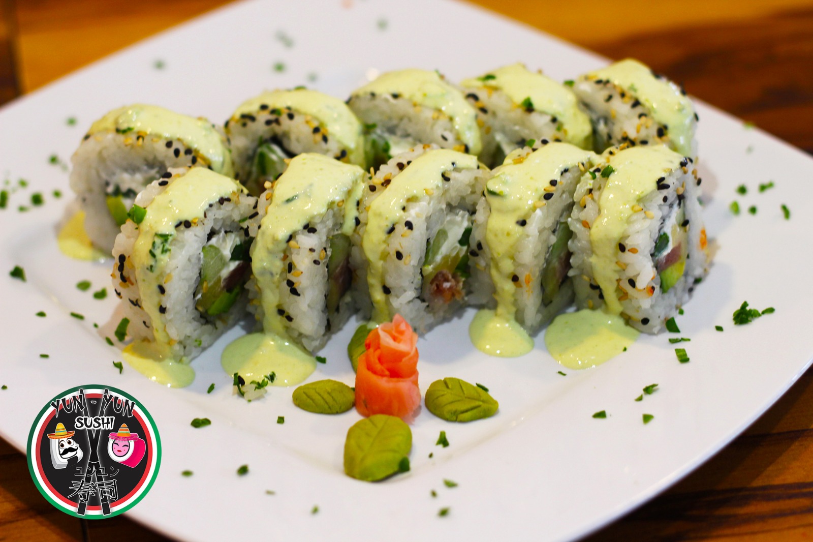 Pollo, camarón y arrachera, queso, Philadelphia, aguacate, chipotle, tampico, ajonjolí y cebollín.