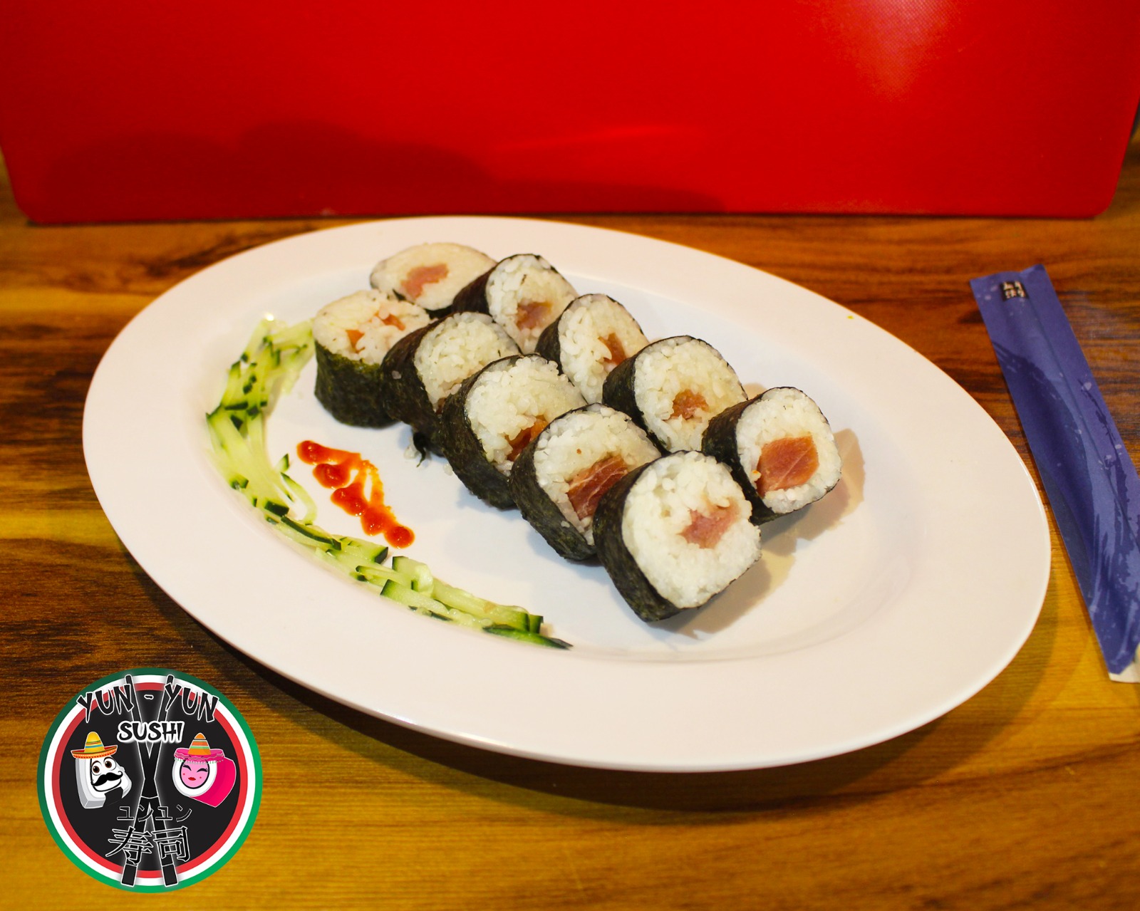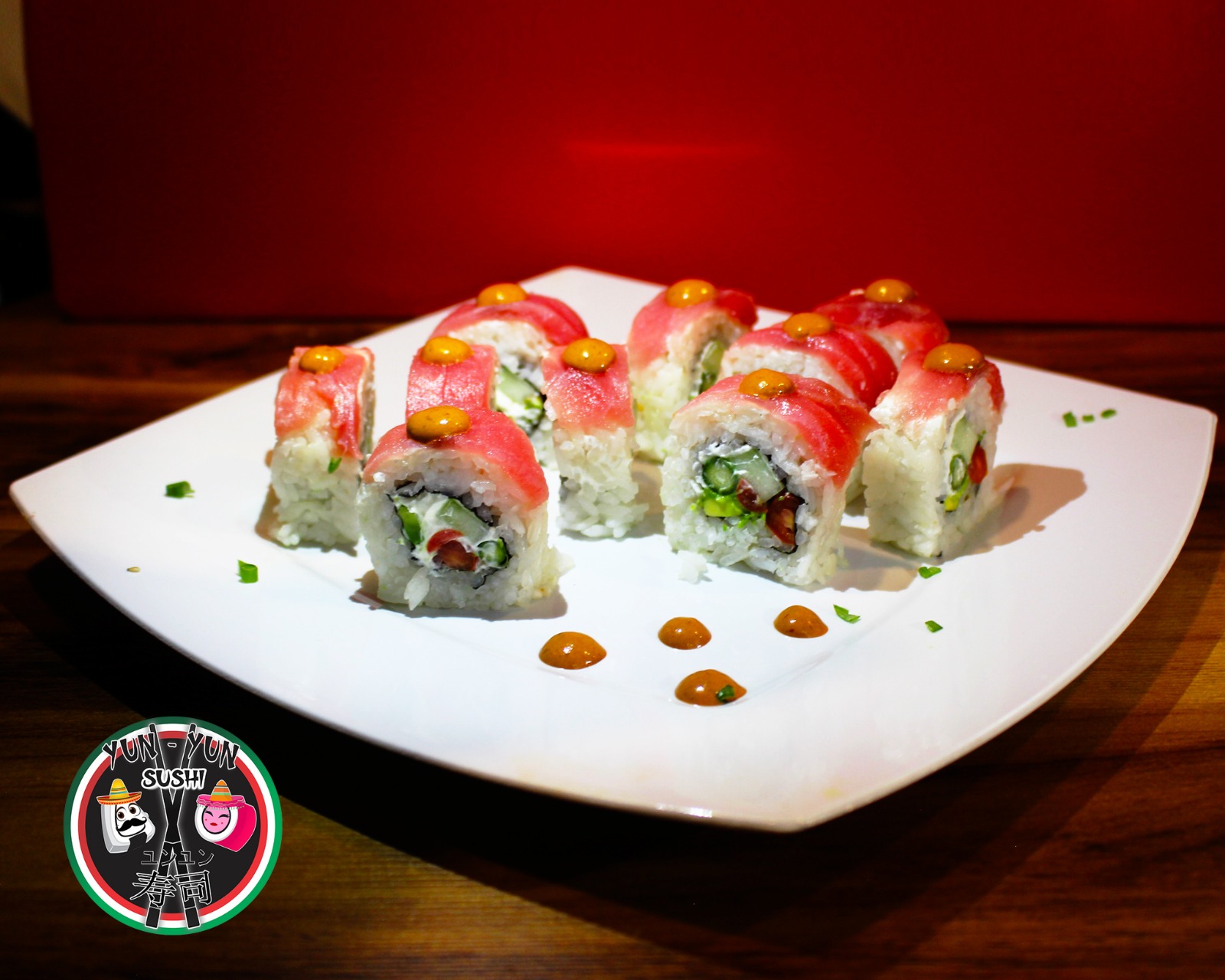 Atún rojo y salsa chipotle por fuera; por dentro aguacate, jitomate cherry, pepino y Philadelphia.