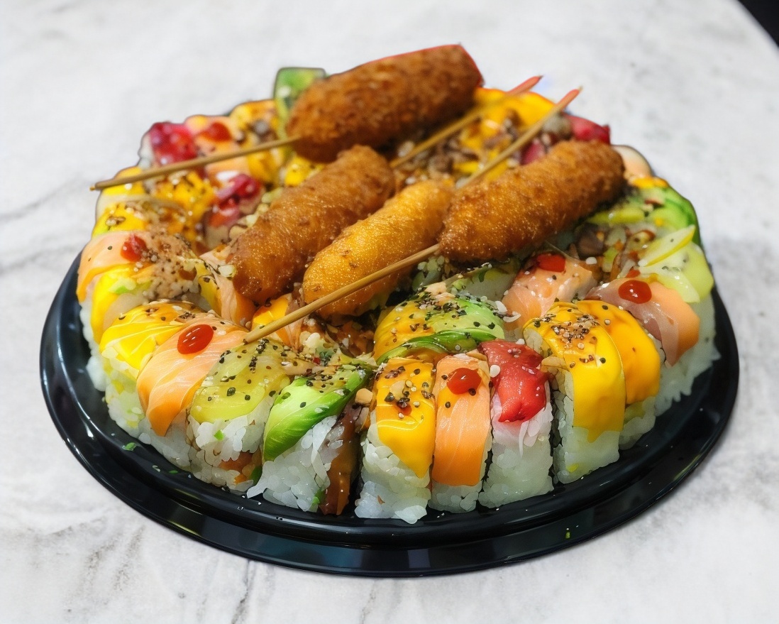 1 Rollo sunset, 1 rollo kawaii, 1 rollo banana, 1 rollo takis fuego, 1 orden de kushiagues plátano macho, Philadelphia, manchego y plátano con queso.