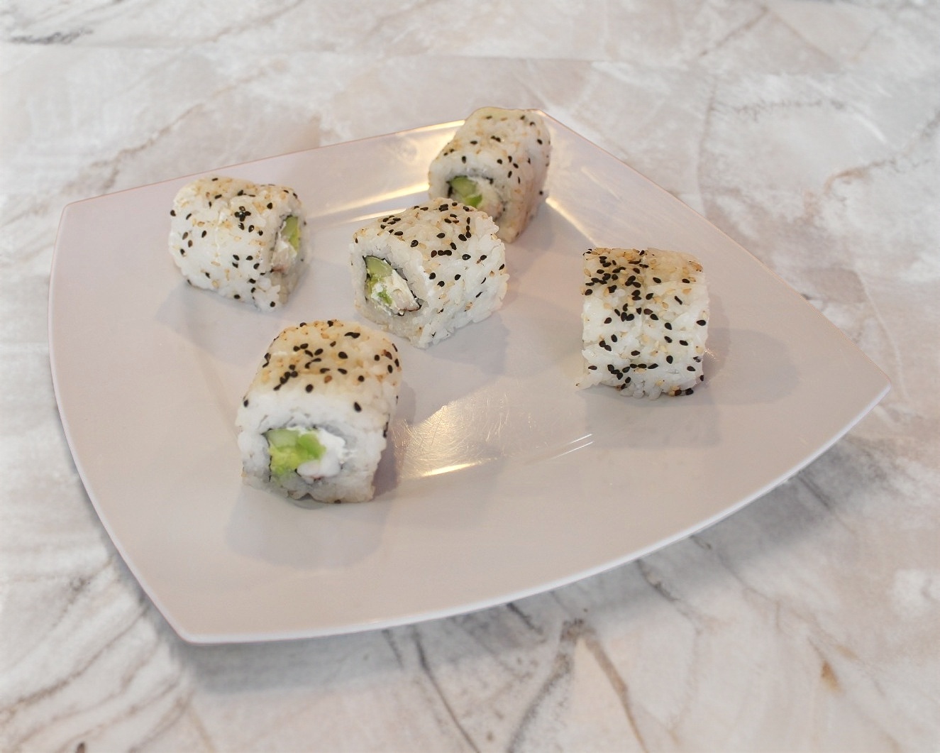 Ajonjolí por fuera, marisco, Philadelphia, pepino y aguacate por dentro.