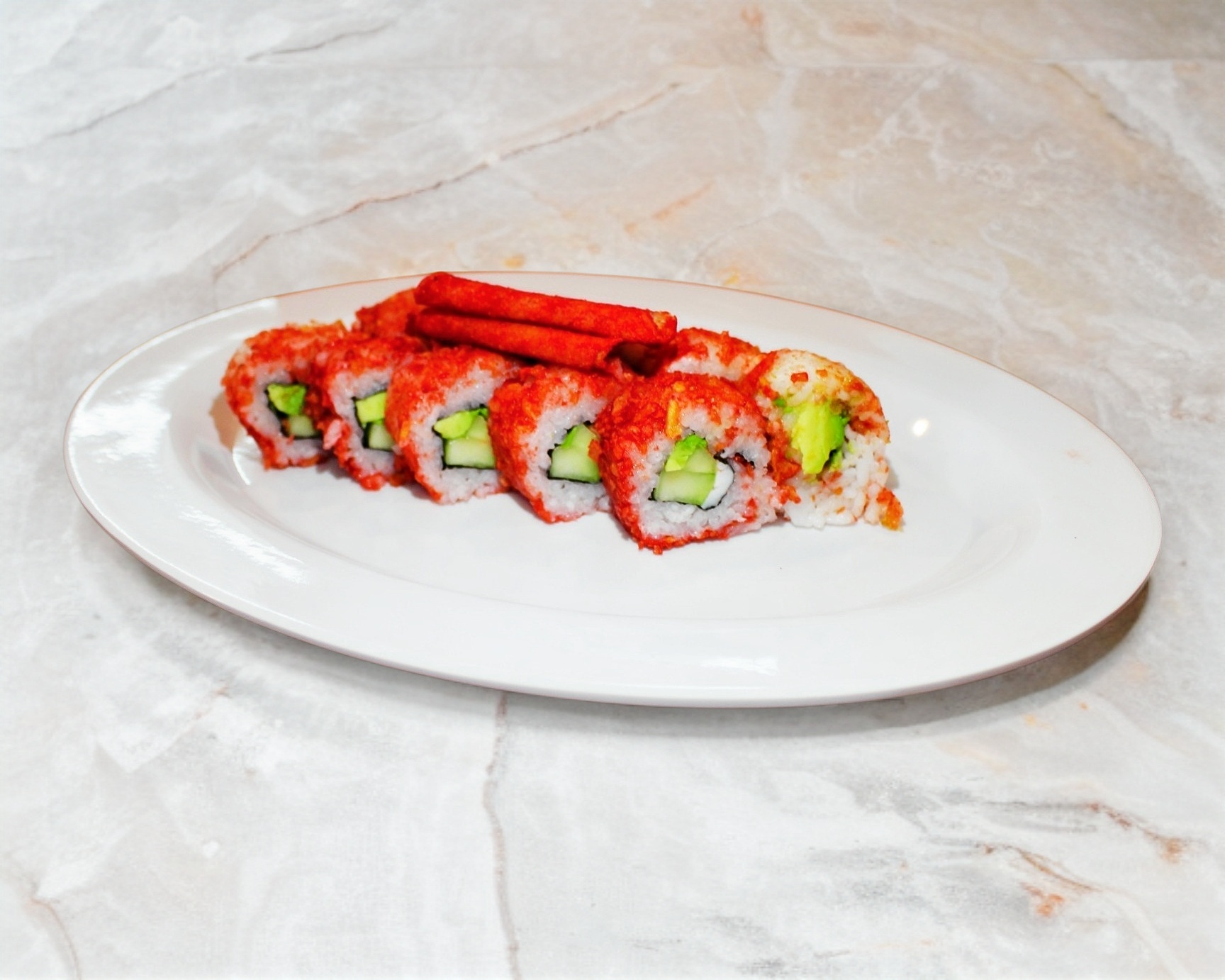 Por fuera takis fuego; por dentro camarón, Philadelphia, aguacate y pepino.