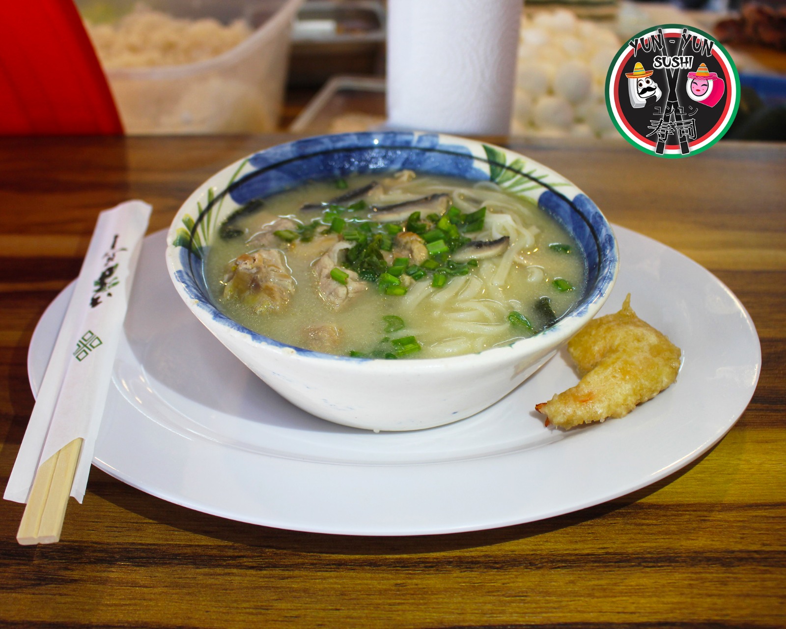 Champiñón, tallarín de arroz, pollo, camarón, tempura, alga, queso manchego y cebollín.