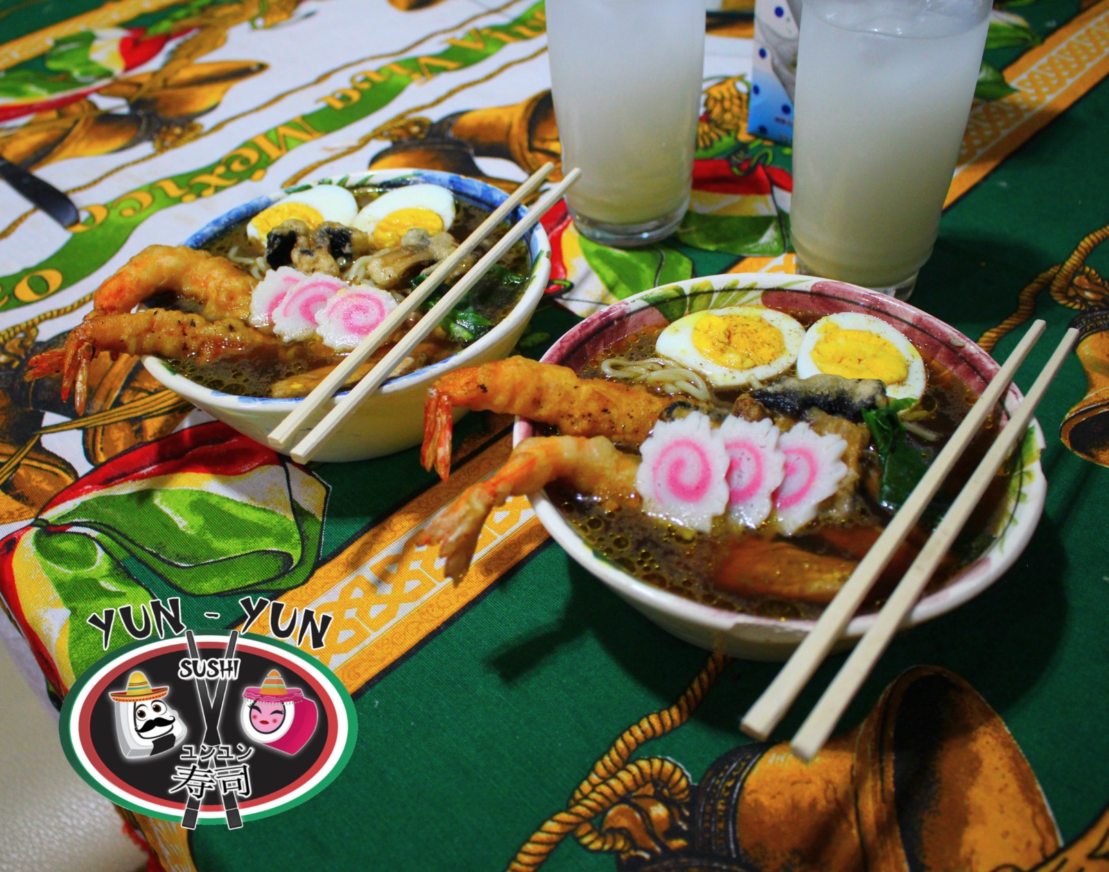 Pasta ramen, carne de puerco, camarón y champiñón tempura, huevo, naruto, cebollín y espinaca.