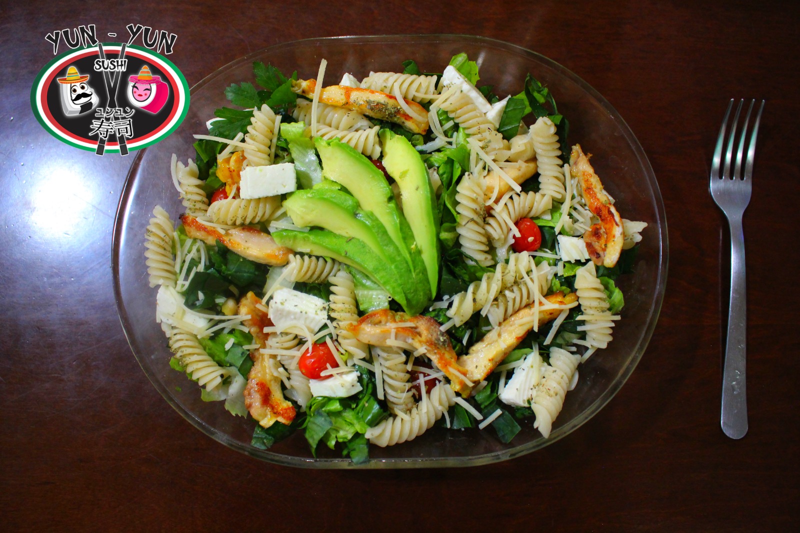 Pasta de tornillo, queso panela, pollo, hiervas finas, jitomate cherry, aguacate, queso parmesano, lechuga y espinaca.