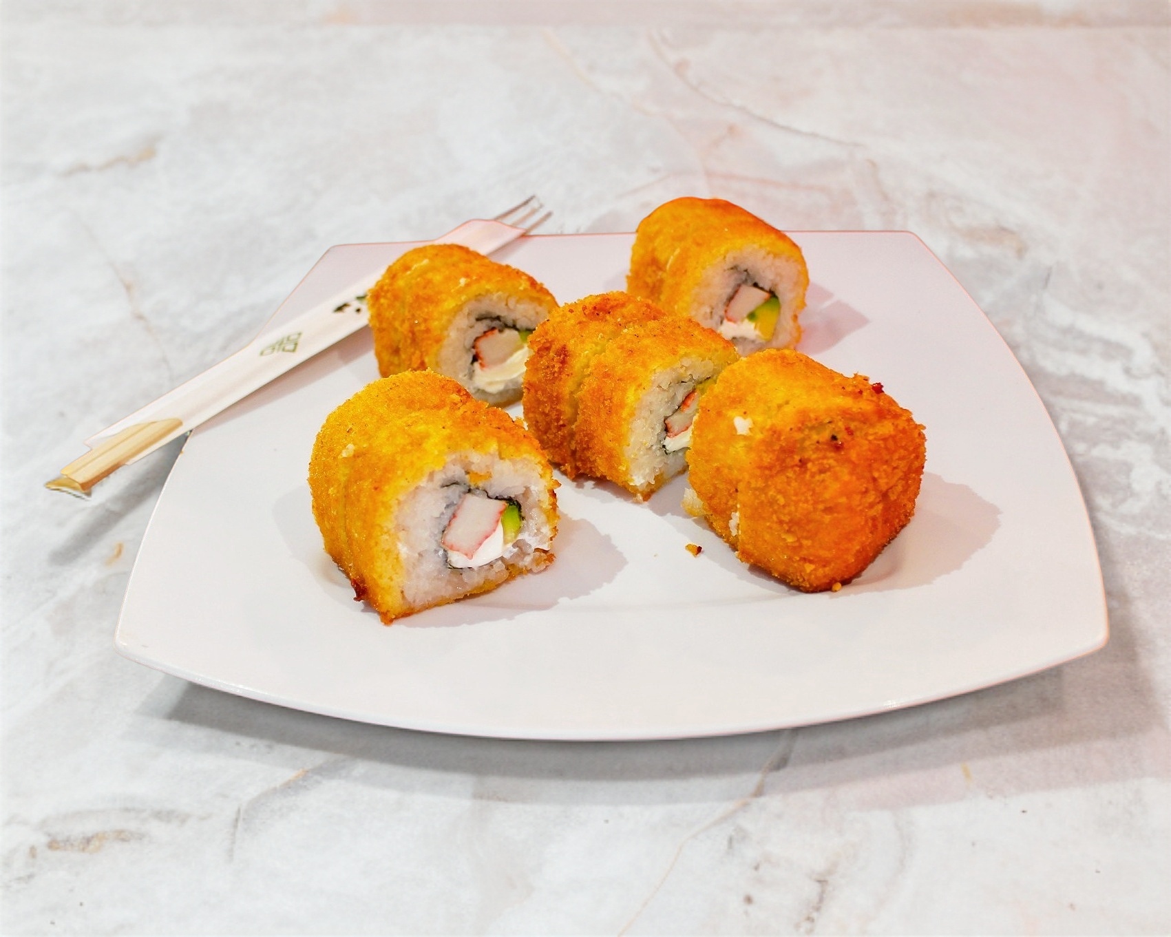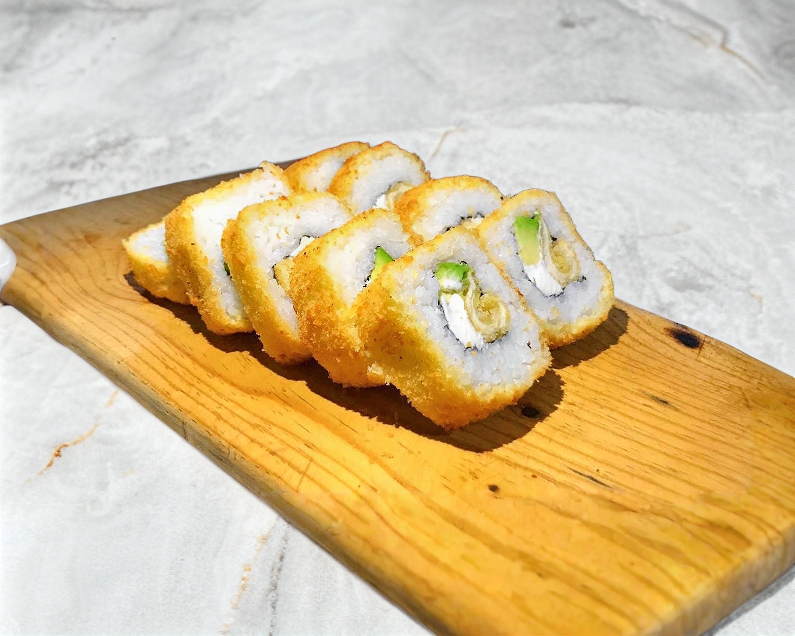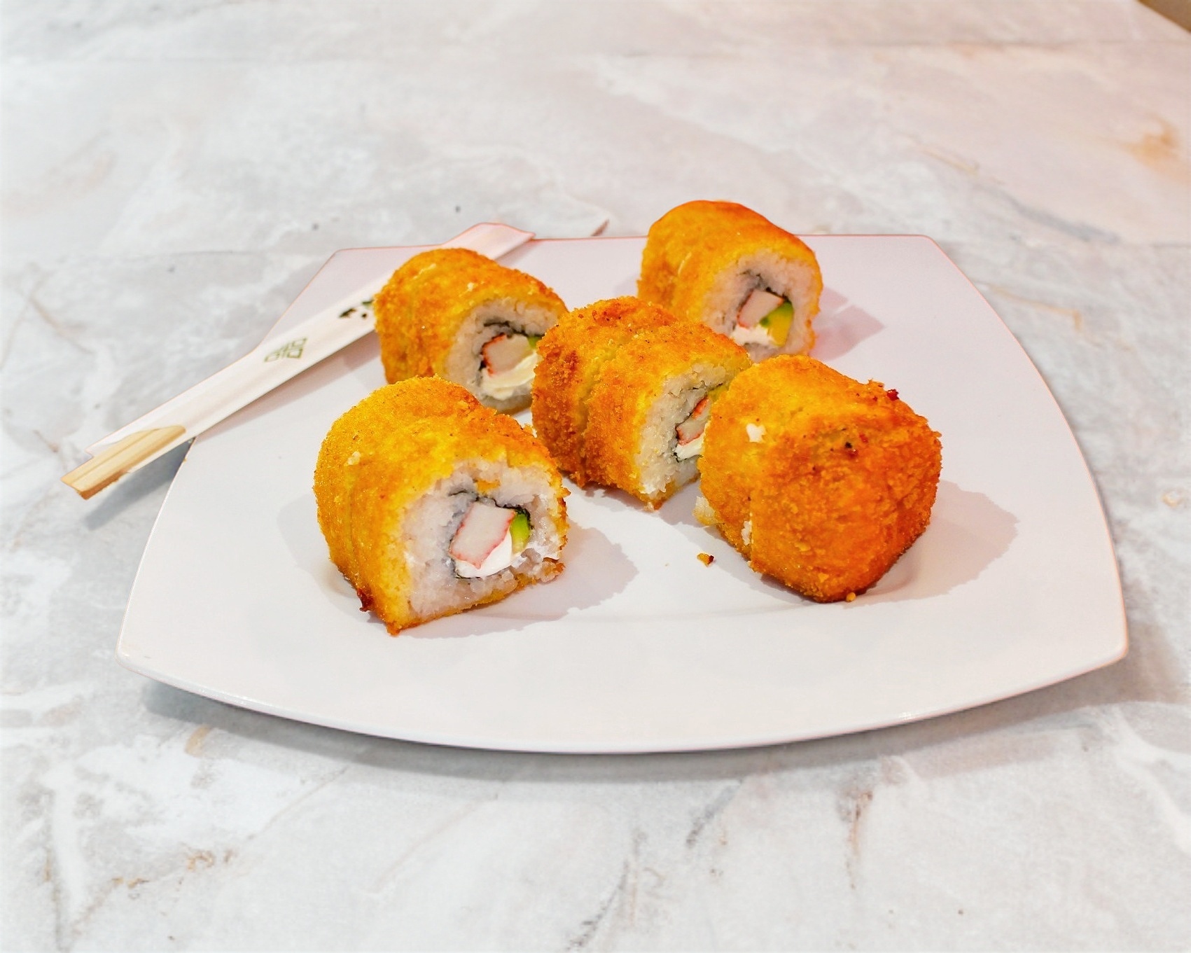 Por fuera empanizado; por dentro marisco, Phialdelphia y aguacate.