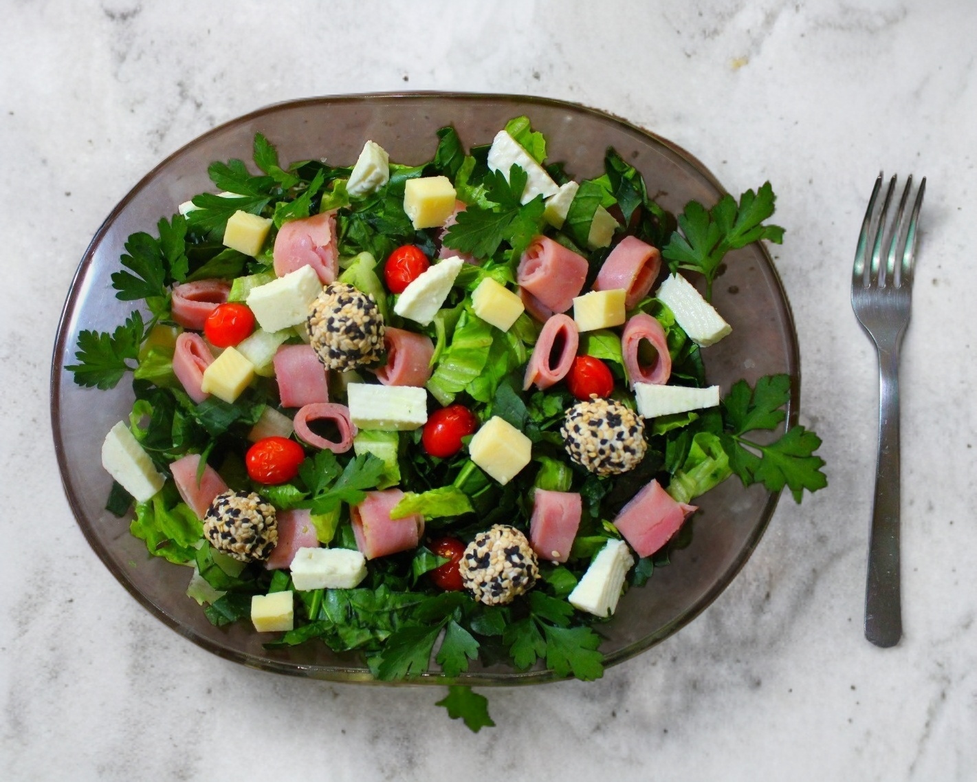 Jamón de pavo, jitomate cherry, queso panela, queso manchego, queso Philadelphia cubierto de ajonjolí, espinaca, lechuga y perejil.
