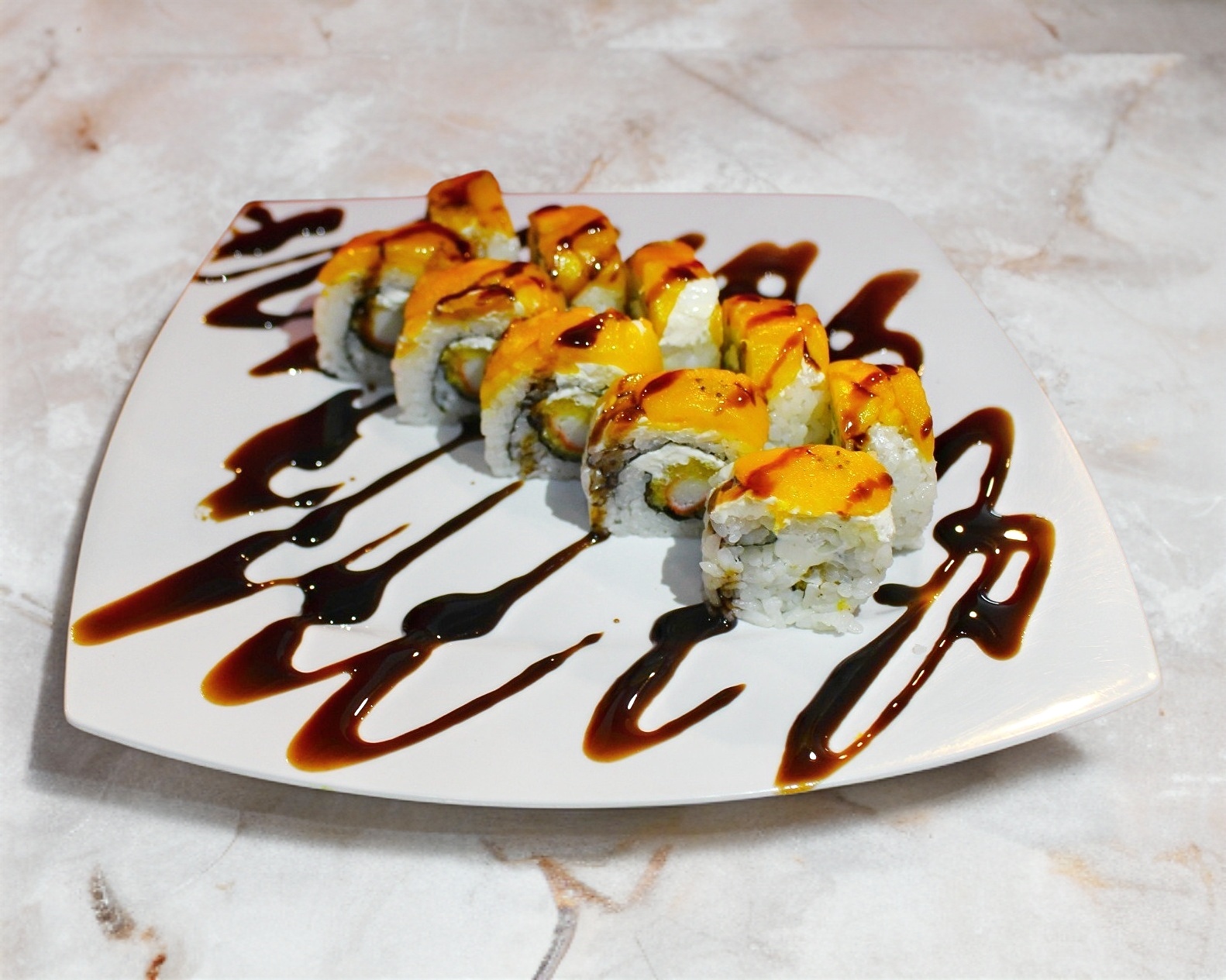 Por fuera mango, aguacate, almendra caramelizada y salsa de anguila; por dentro camarón empanizado, coco rallado, queso Philadelphia y aguacate.