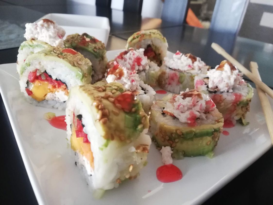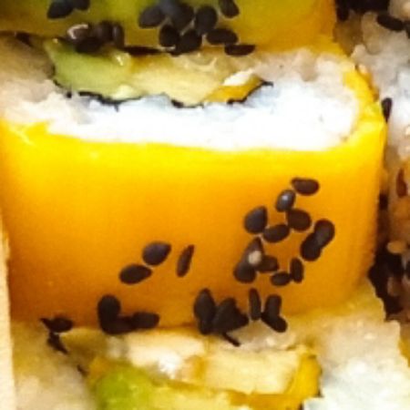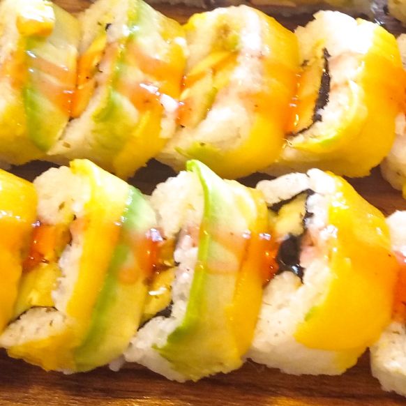Por fuera: mango y aguacate. Por dentro: queso crema, pepino, aguacate, piña , mango, ajonjolí caramelizado y alga nori.