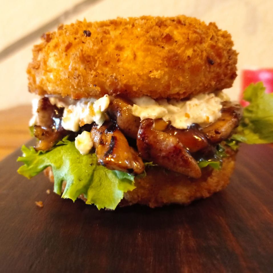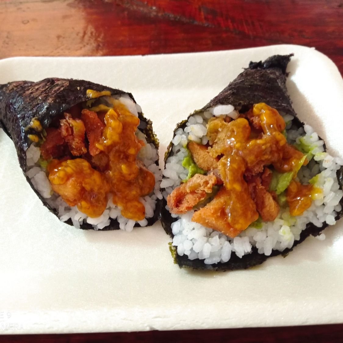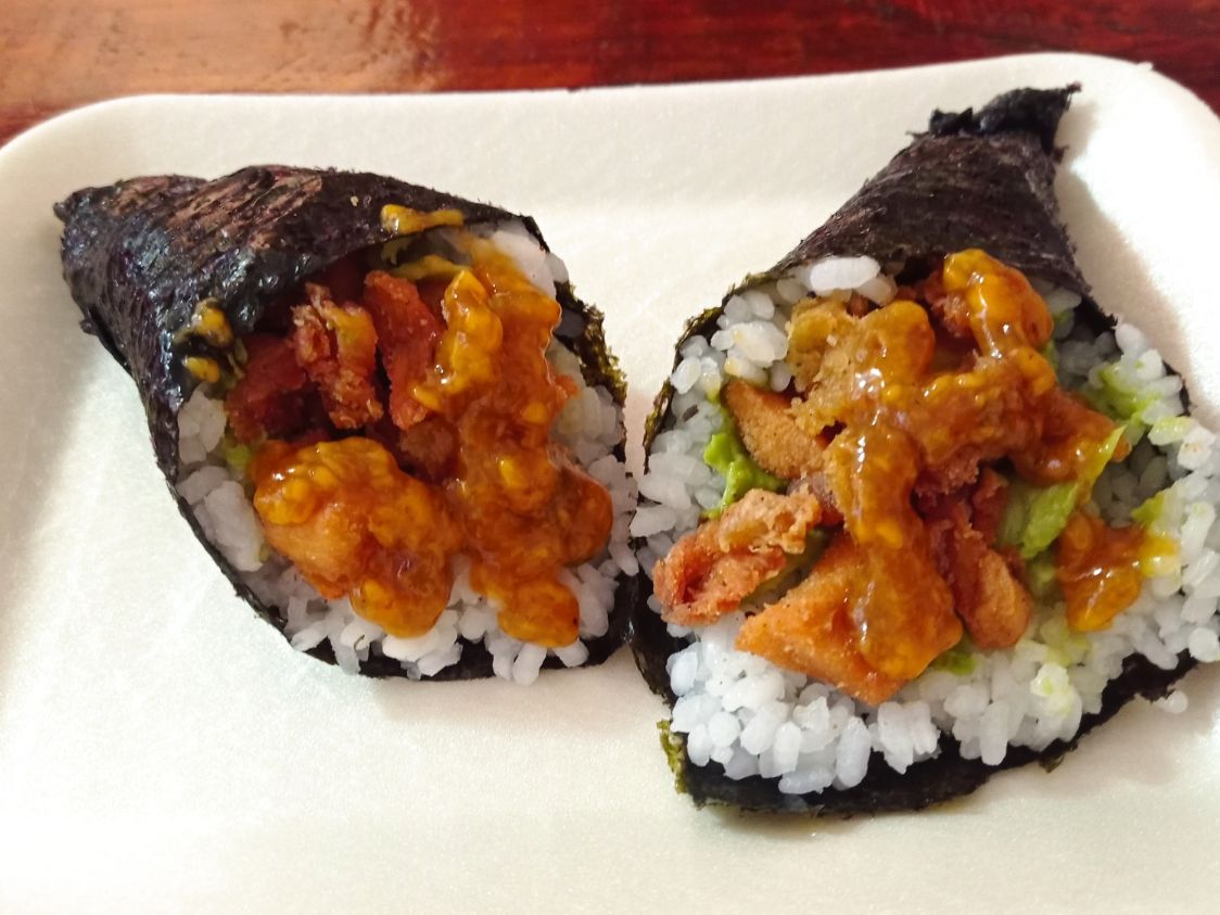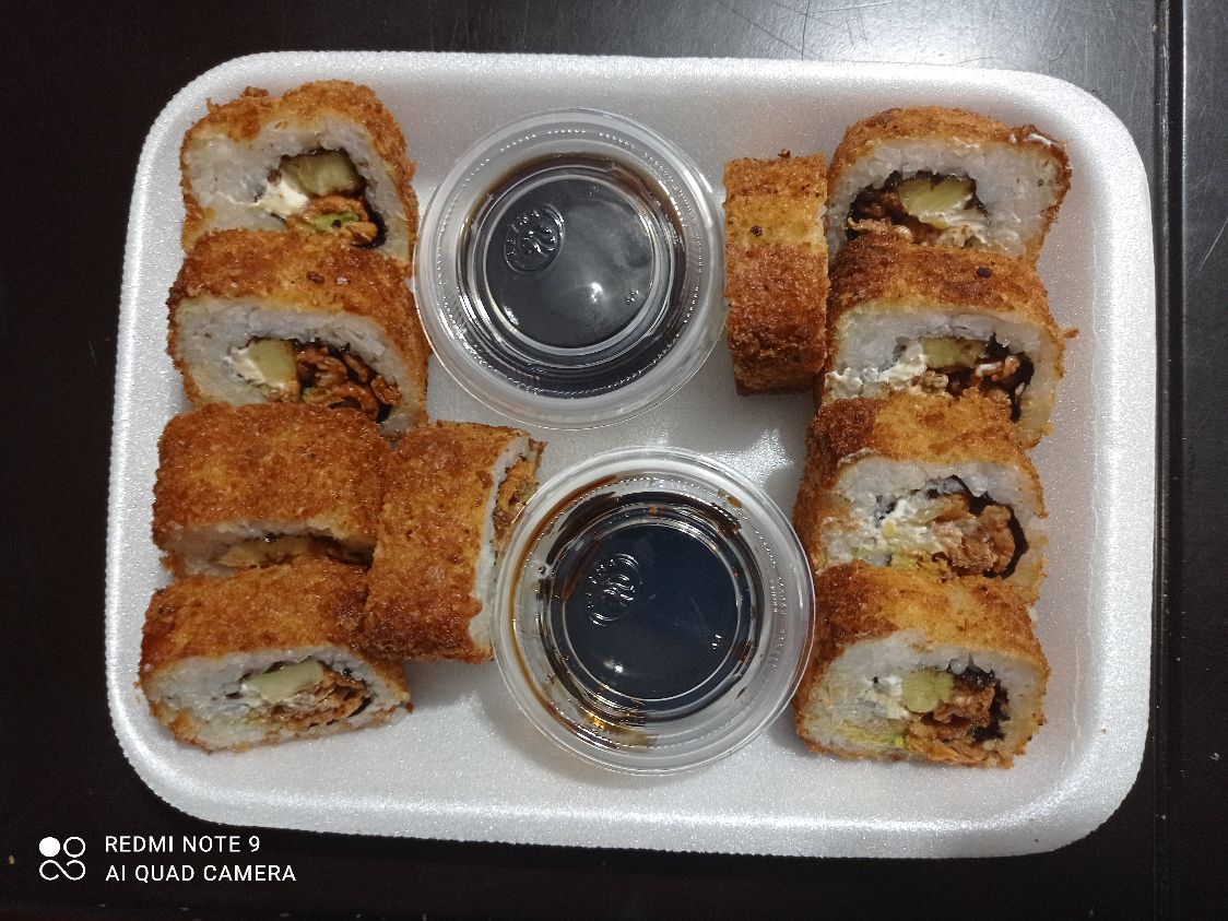 Pan de sushi empanizado con panko, queso gouda, lechuga, aguacate, salsa spacy, salsa teriyaki, salsa tampico, proteína pollo o carne al pastor con piña.