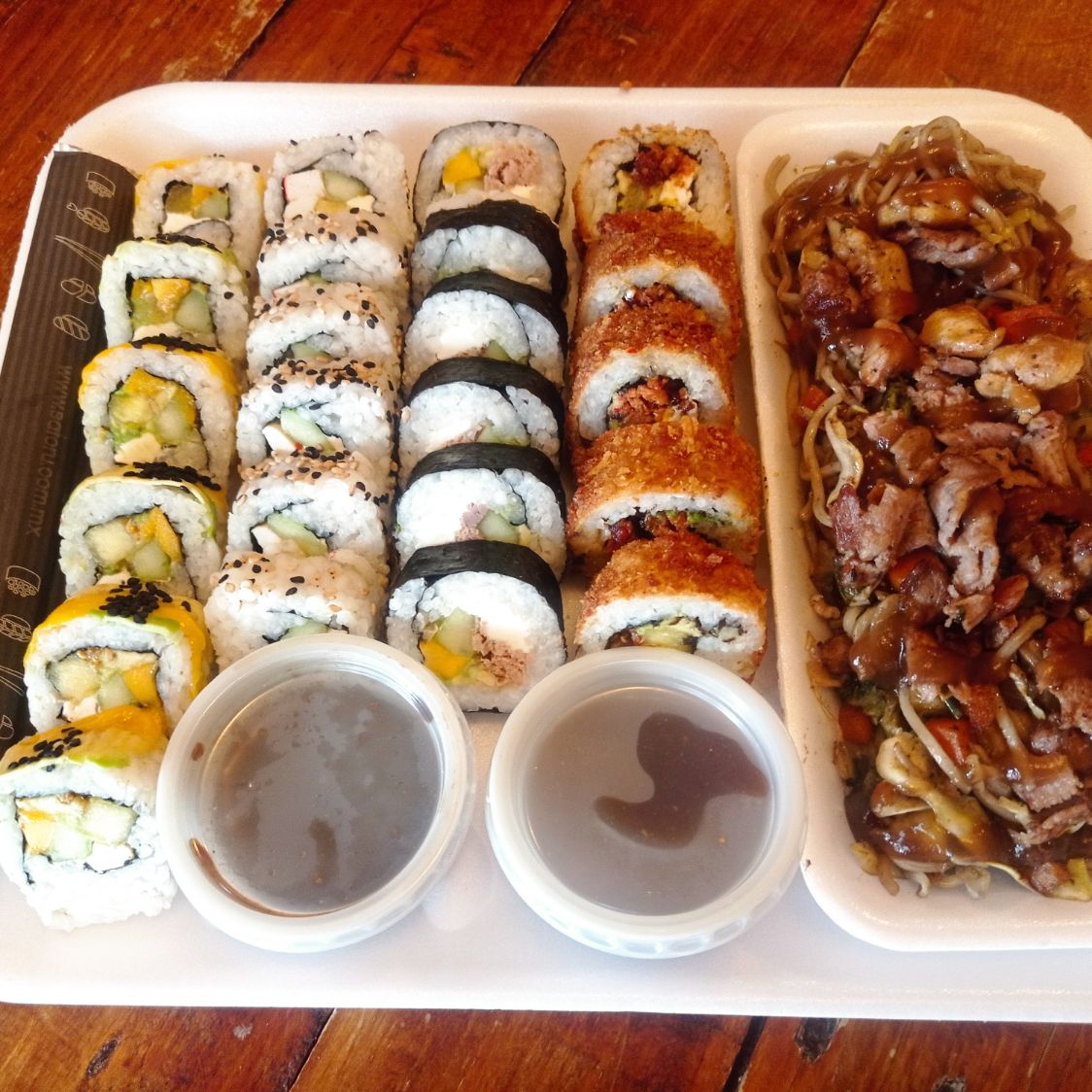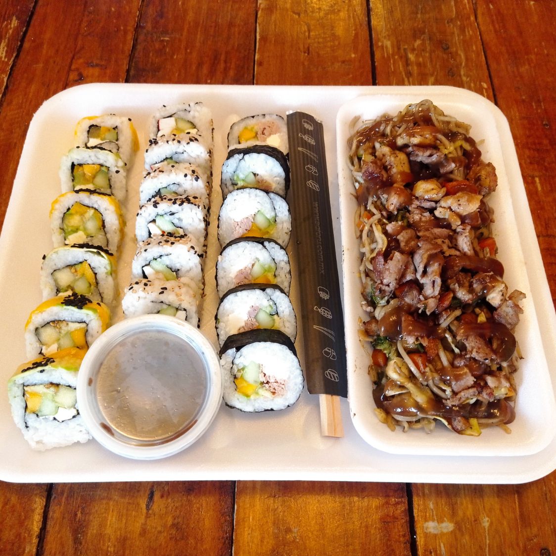 Fideo yakisoba: pollo / puerco o mixto*1 + 23 psz de sushi variado*1