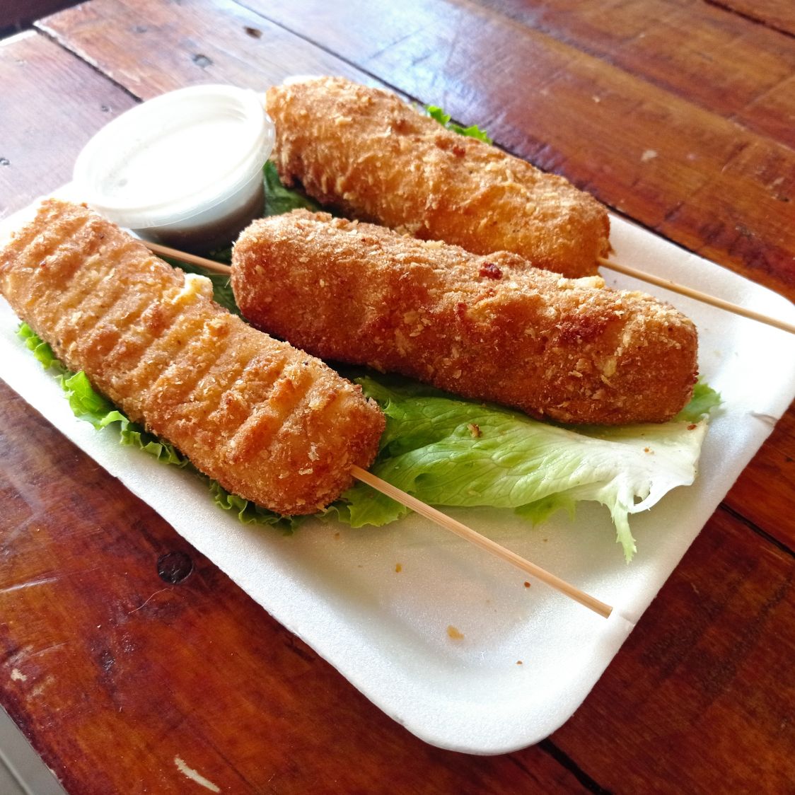 3 Banderillas de plátano empanizadas, grandes.