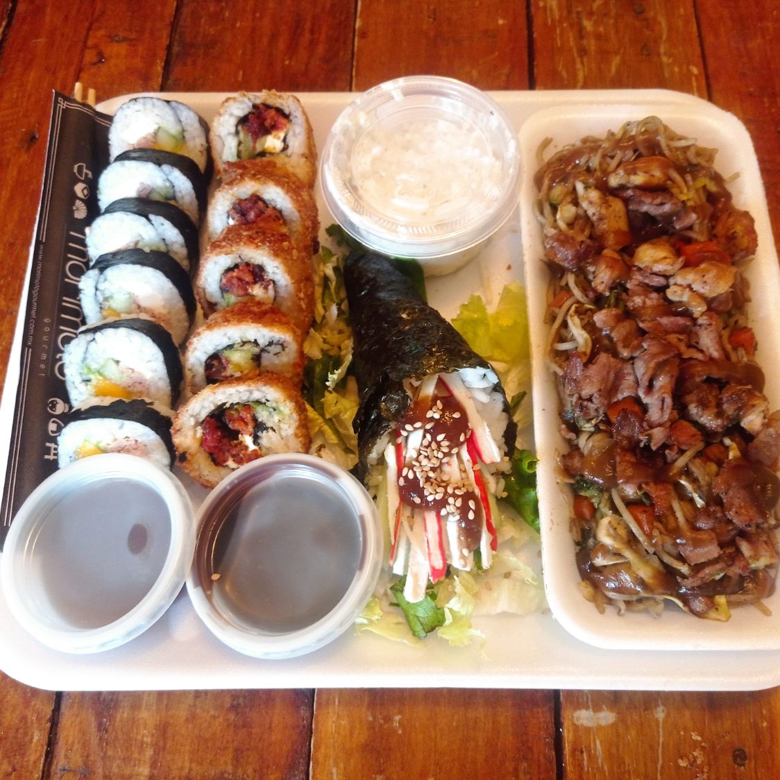 Salsa de Soya*1 + 250g de arroz Yakimeshi Mixto (cerdo y pollo).*1 + 6pzs de Nori rol Atun*1 + 5 pzs de empanizado pastor piña*1 + Salsa Tampico*1 + Salsa Teriyaki*1 + Tamakis de cangrejo*1