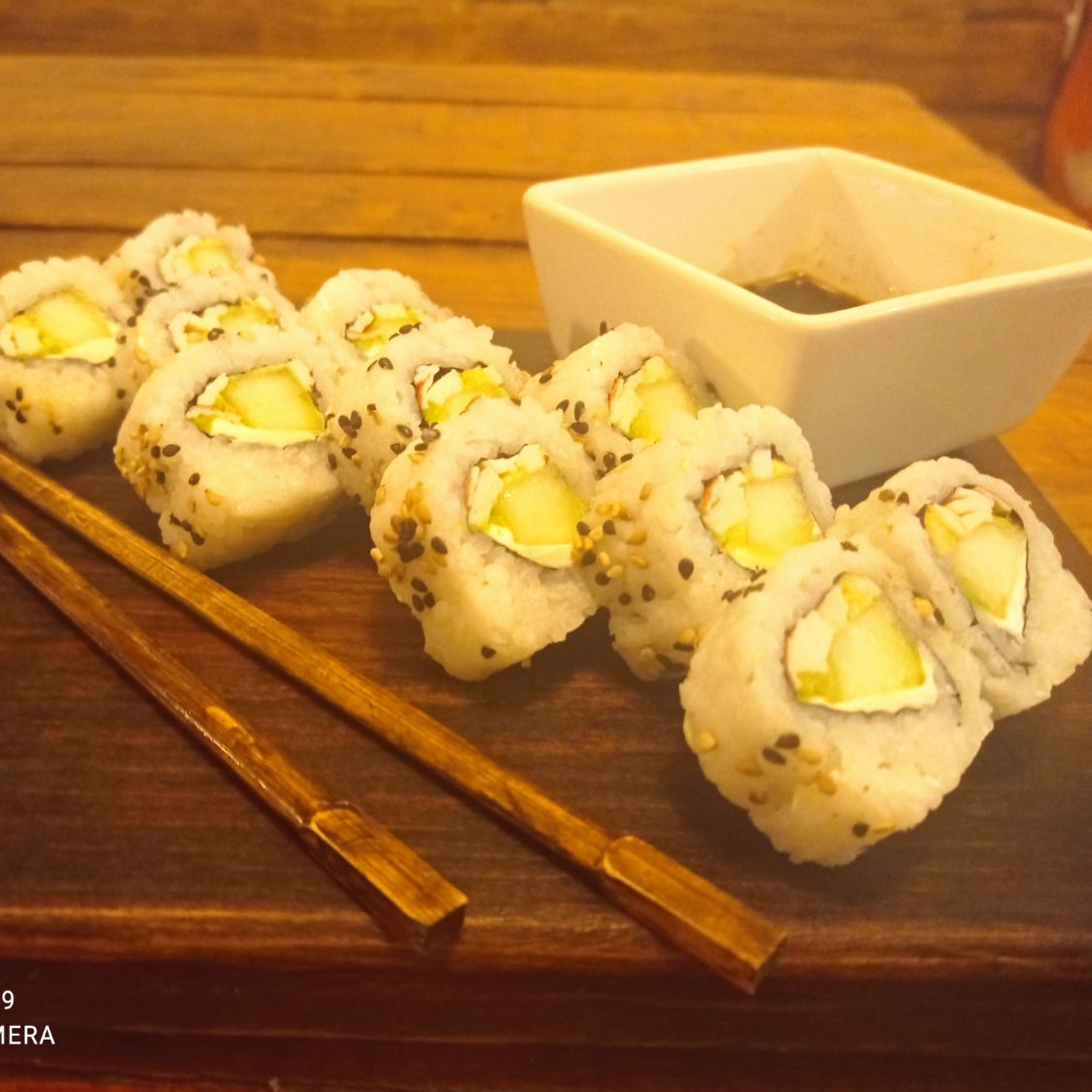 2 Pzs por dentro. Arroz, aguacate, queso philadelphia, proteina y salsa de mango.