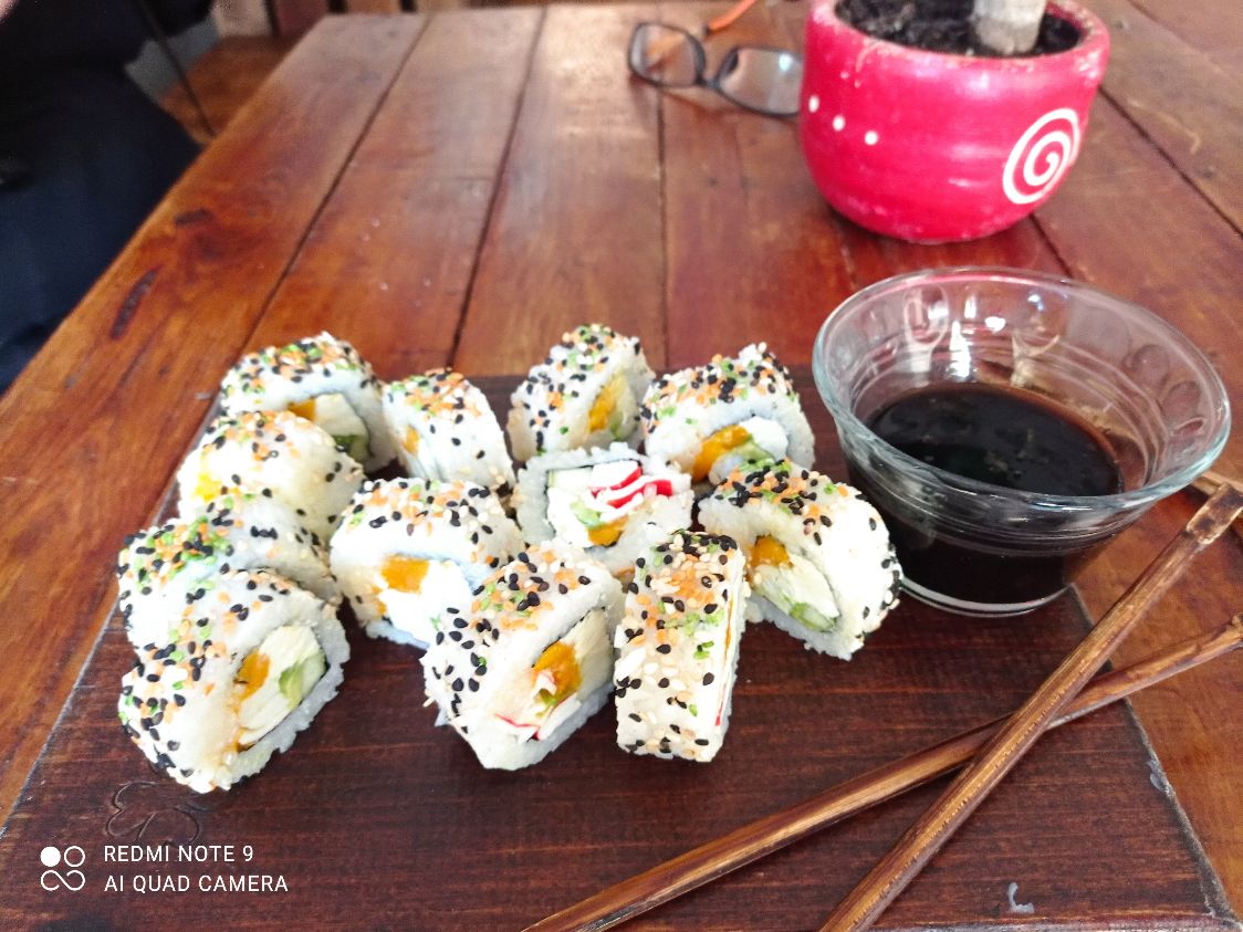 Por fuera: alga nori. Por dentro: arroz yakimeshi, queso crema, col, zanahoria, aguacate.