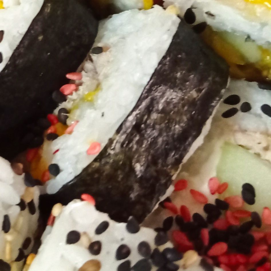 Por fuera: ajonjolí a caramelizado, por dentro: queso Philadelphia, pepino, aguacate, mango o piña, alga nori.