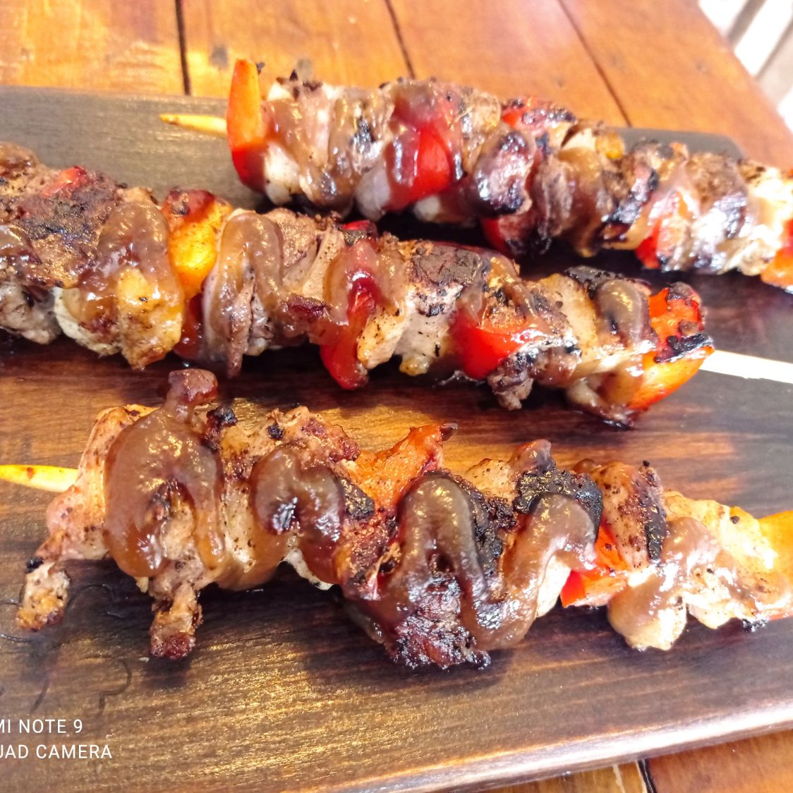 3 Pzs de banderilla de carne de cerdo y pollo con cebolla y pimiento morrón. aderezadas con salsa teriyaki con ajonjolí.