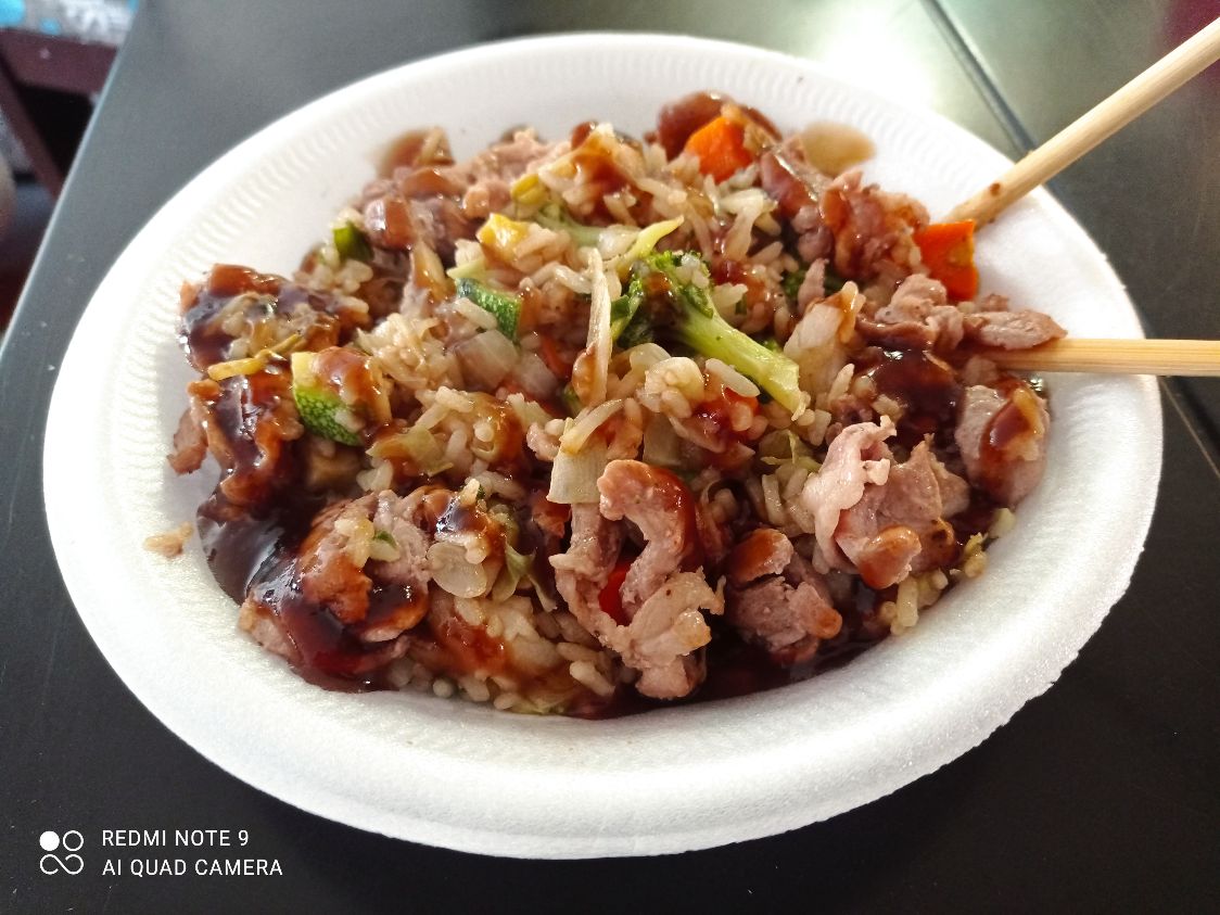 480 Gramos de arroz blanco, cebolla, cebollín, zanahoria, calabaza, col, brócoli, germen de soya. acompañado de salsa teriyaki y proteína cerdo/pollo.