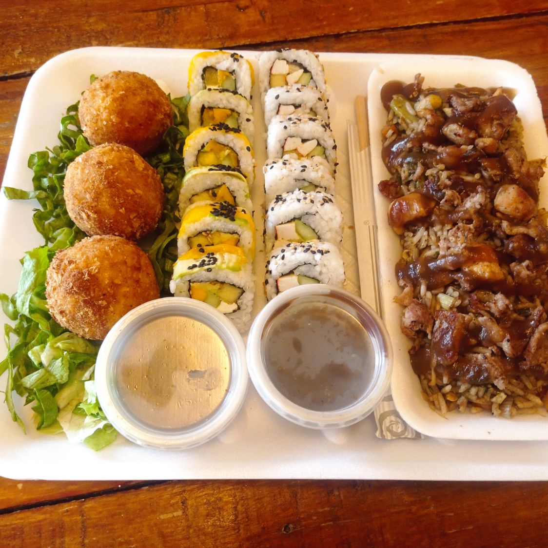 Arroz yakimeshi: pollo / puerco o mixto*1 + 12 psz de sushi variado*1 + Bolitas de Arroz*1