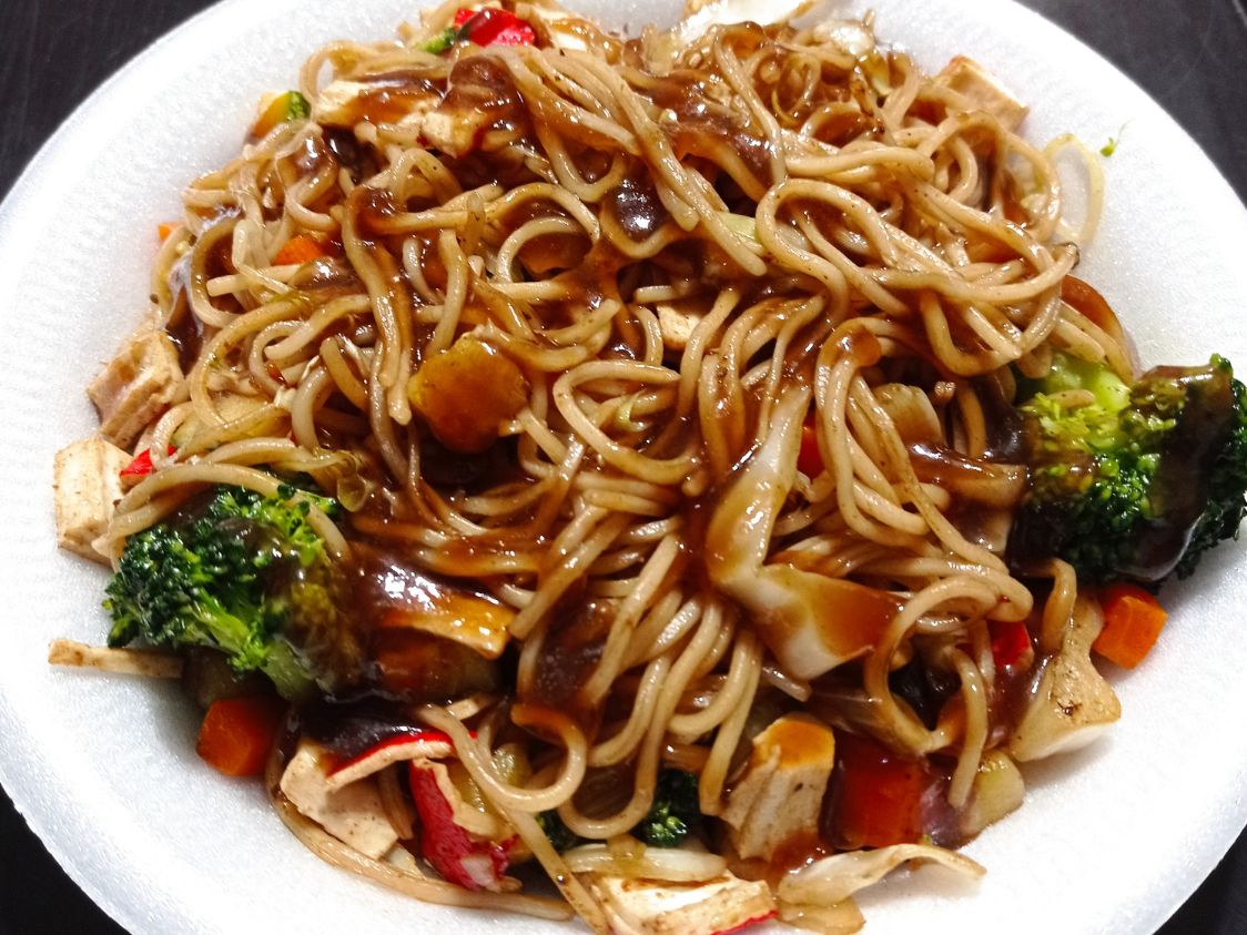 480 Gramos de fideo frito, cebolla, cebollín, zanahoria, calabaza, col, brócoli, germen de soya, acompañado de salsa teriyaki y proteína.