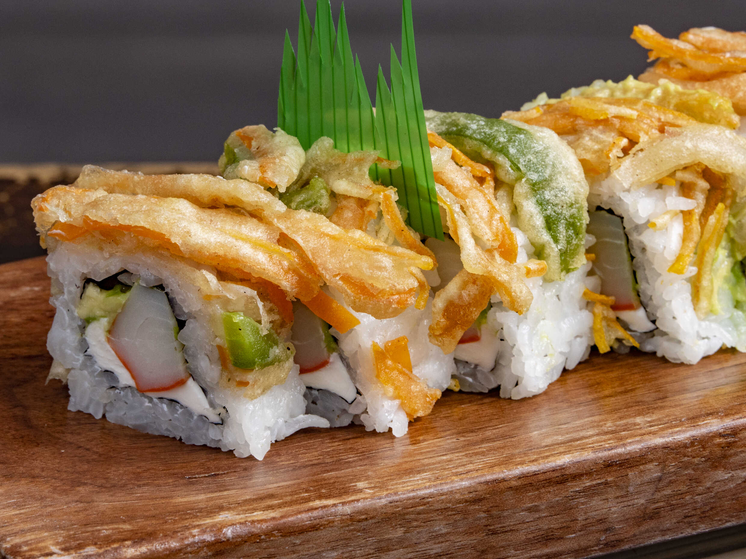Surimi, aguacate, queso, chiles, envuelto con verdura picada y capeada con pasta tempura.