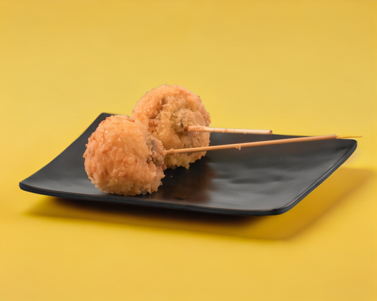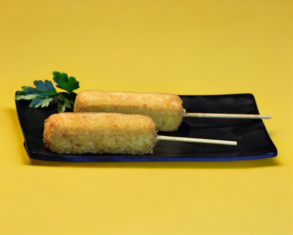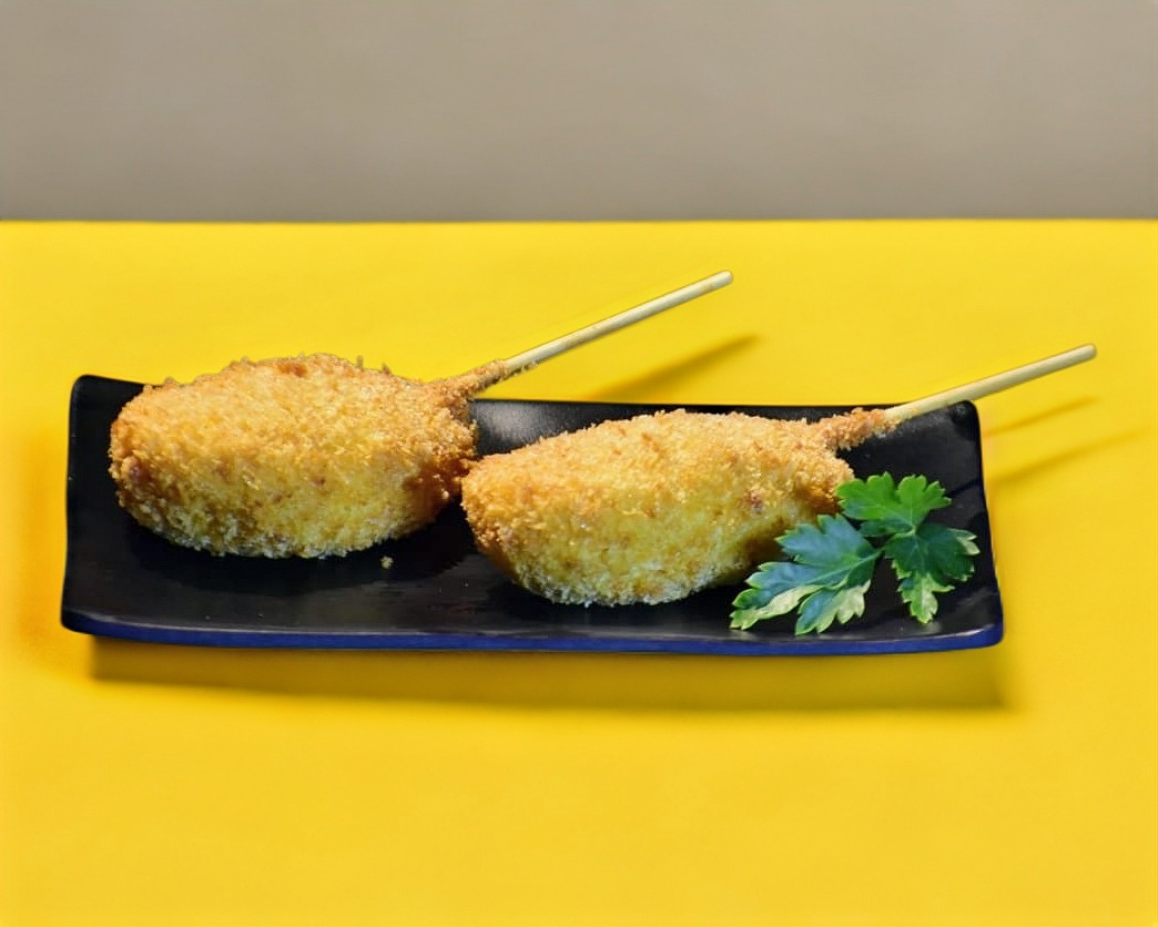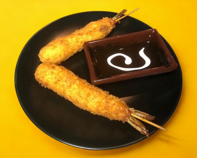 Surimi, aguacate, queso Philadelphia, envuelto en queso manchego y capeado con pasta, tempura.