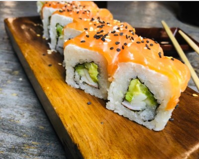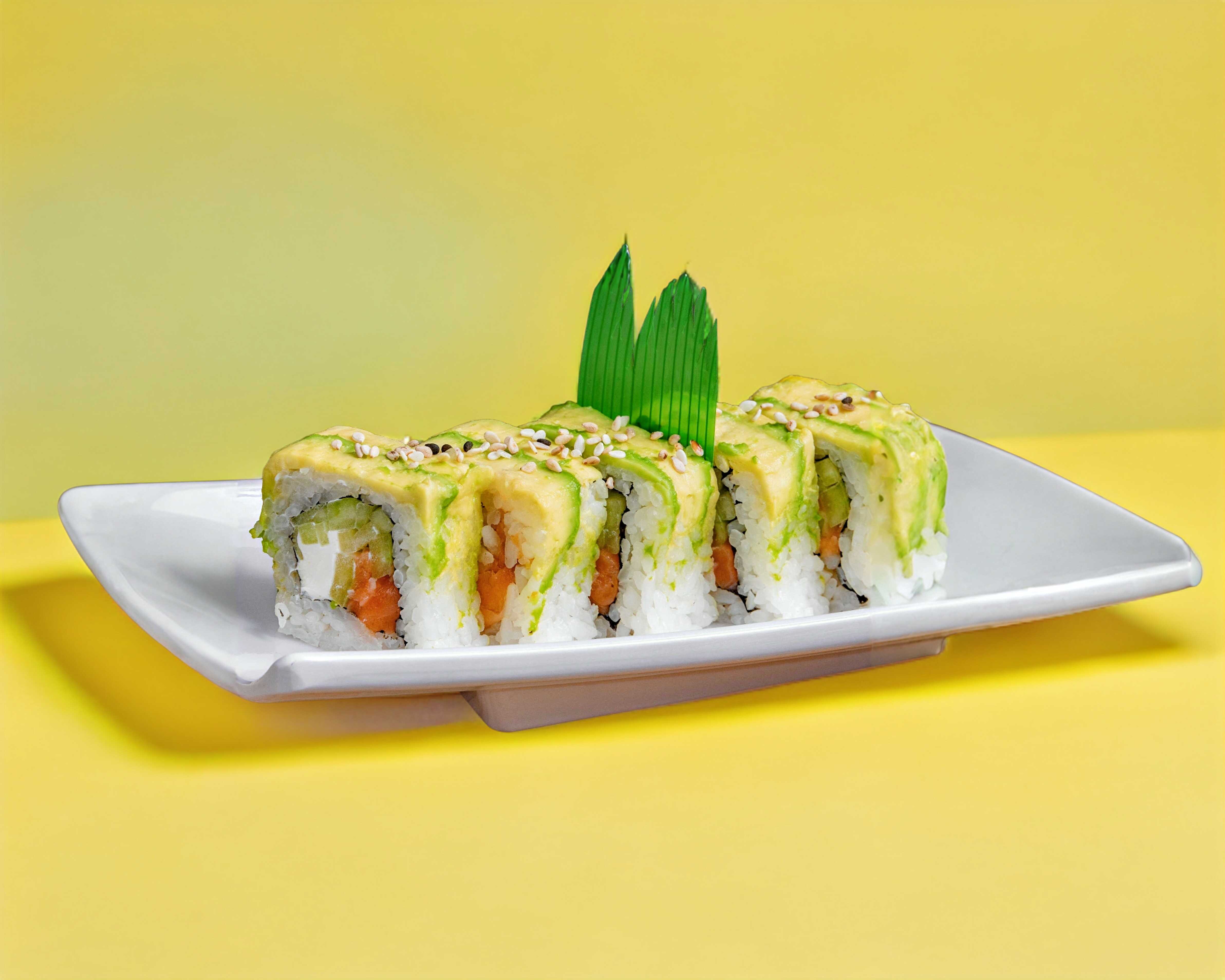 Pepino, aguacate, surimi, envuelto en queso Philadelphia y salmón ahumado.