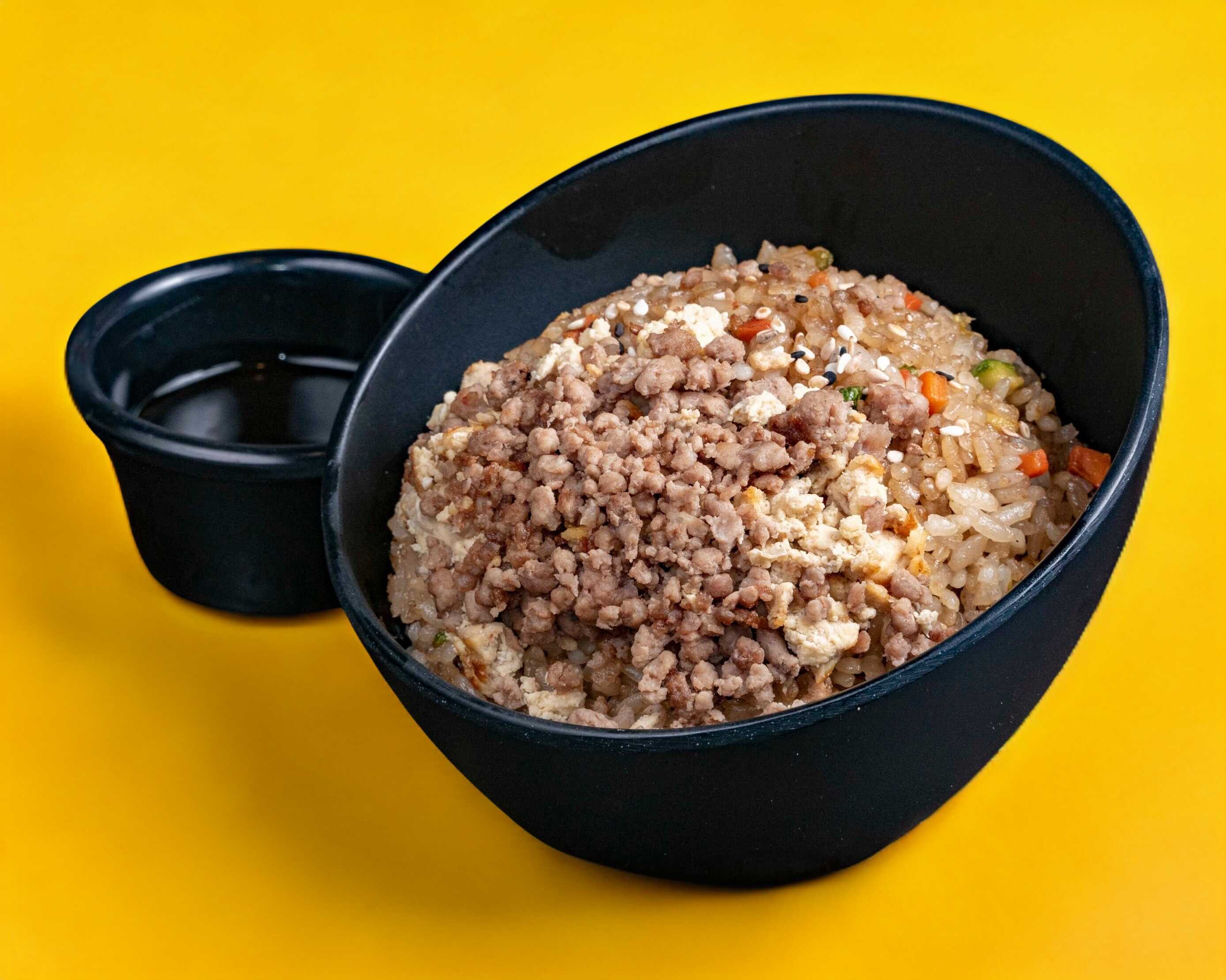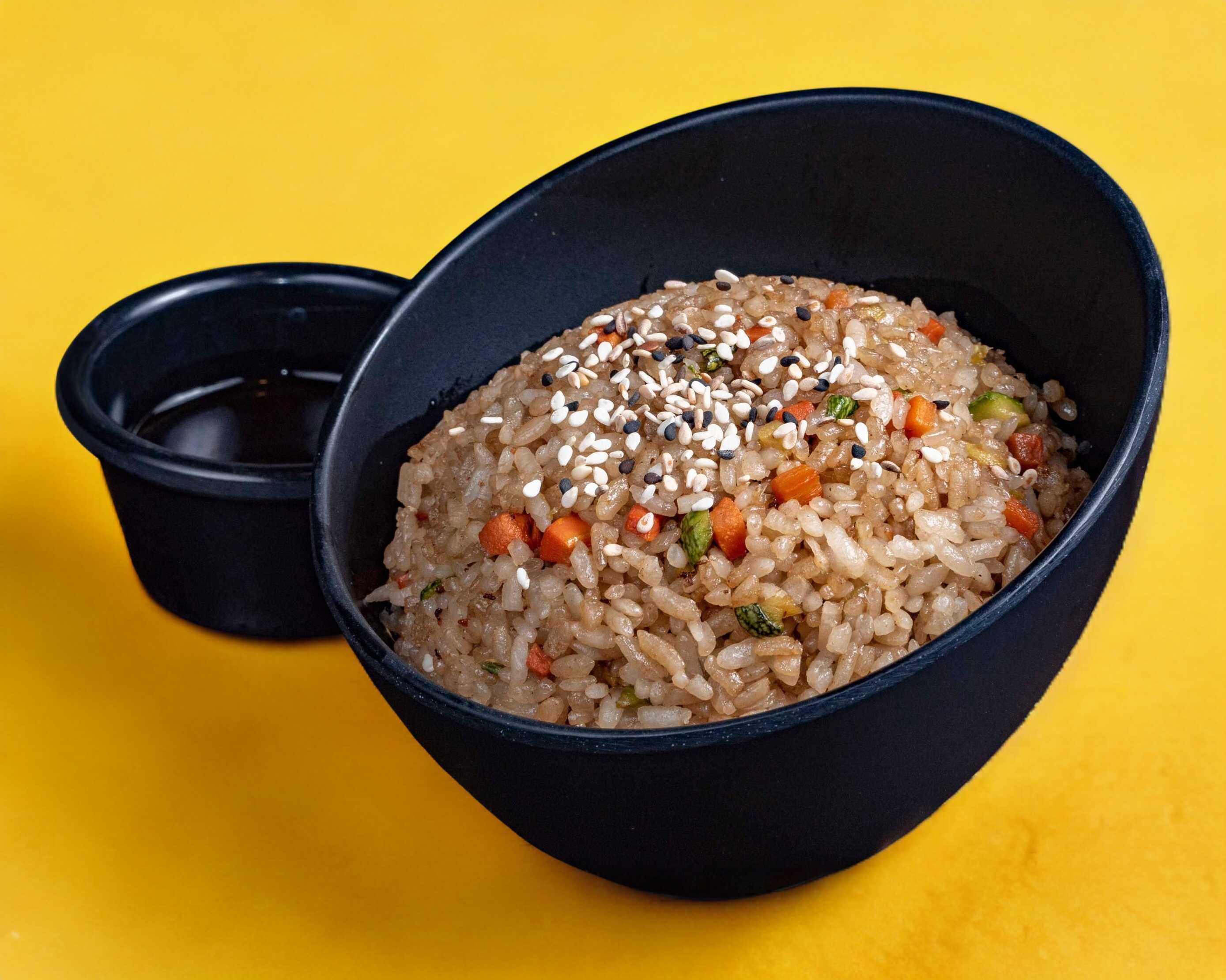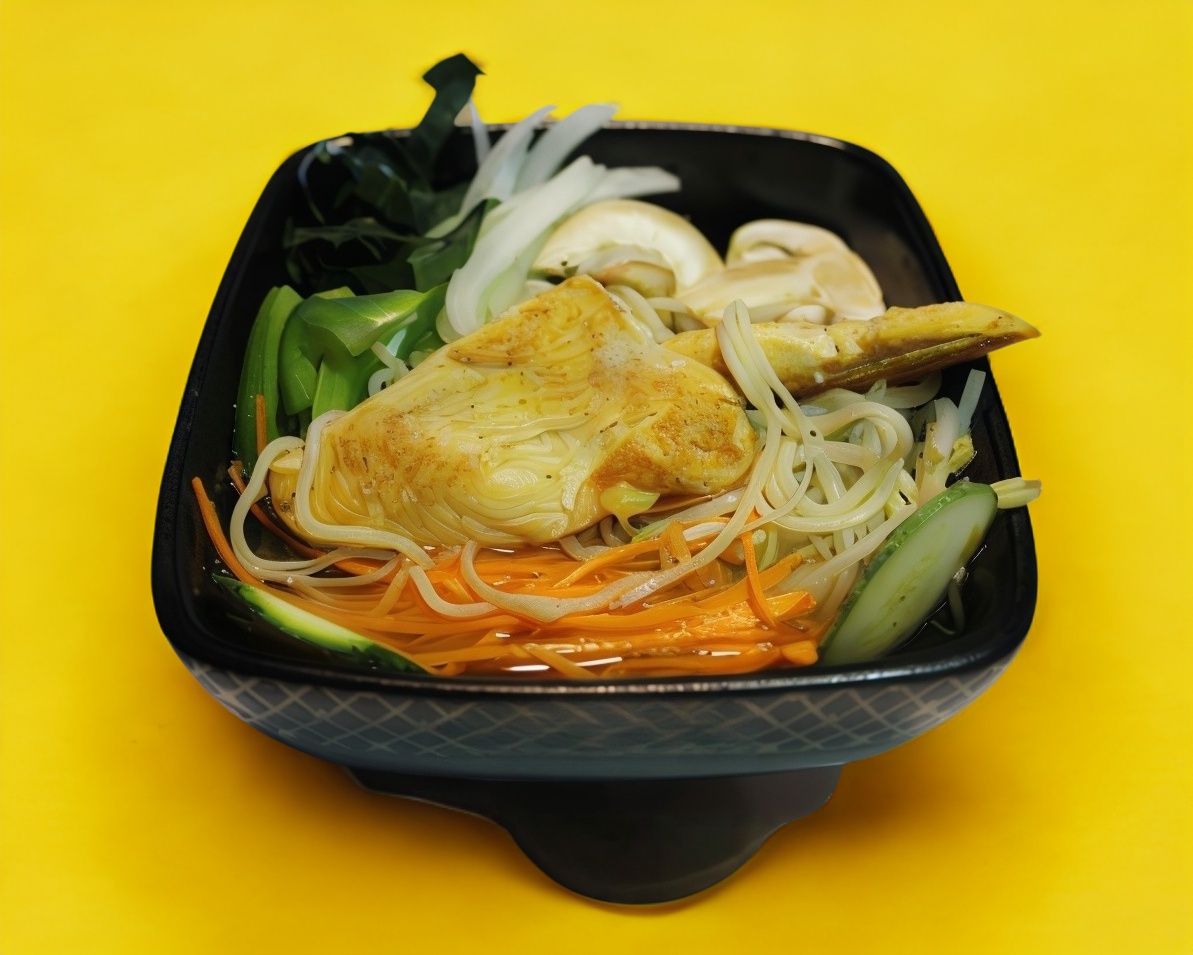 Base de soya, pimiento, cebolla, zanahoria, champiñón, fideos de arroz y pollo.
