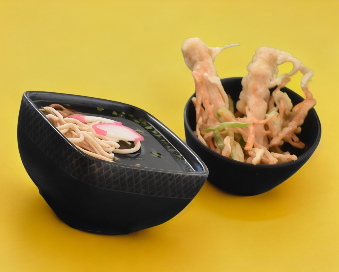 Base de soya, pimiento, cebolla, zanahoria, fideos de arroz, hurasamen, camarón, surimi.