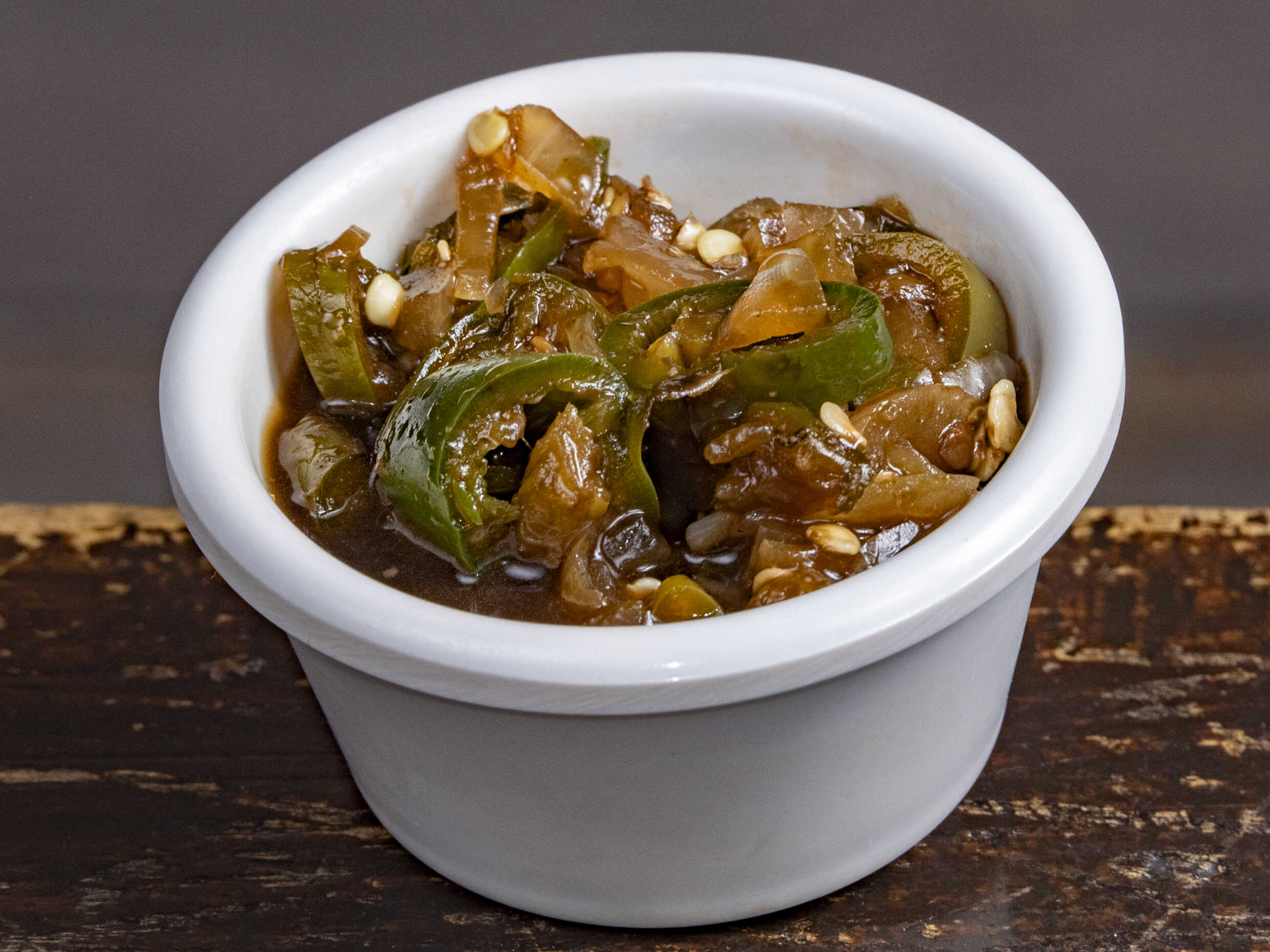 Base de soya, pimiento, cebolla, zanahoria, fideos ramen, wakame y pollo o pesacado.