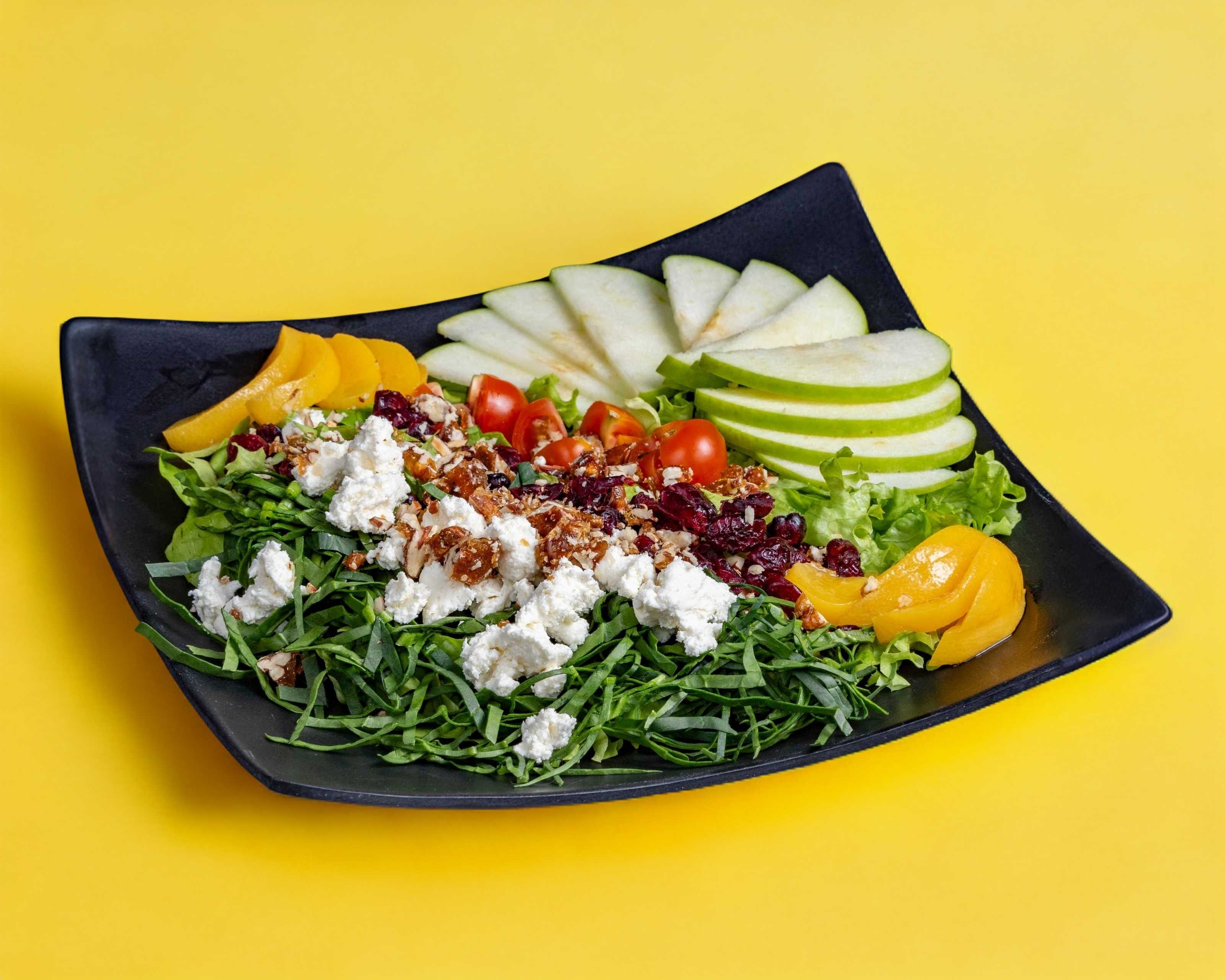 Lechugas, queso de cabra, nuez caramelizada, manzana, arándano, durazno en almíbar, aderezo.