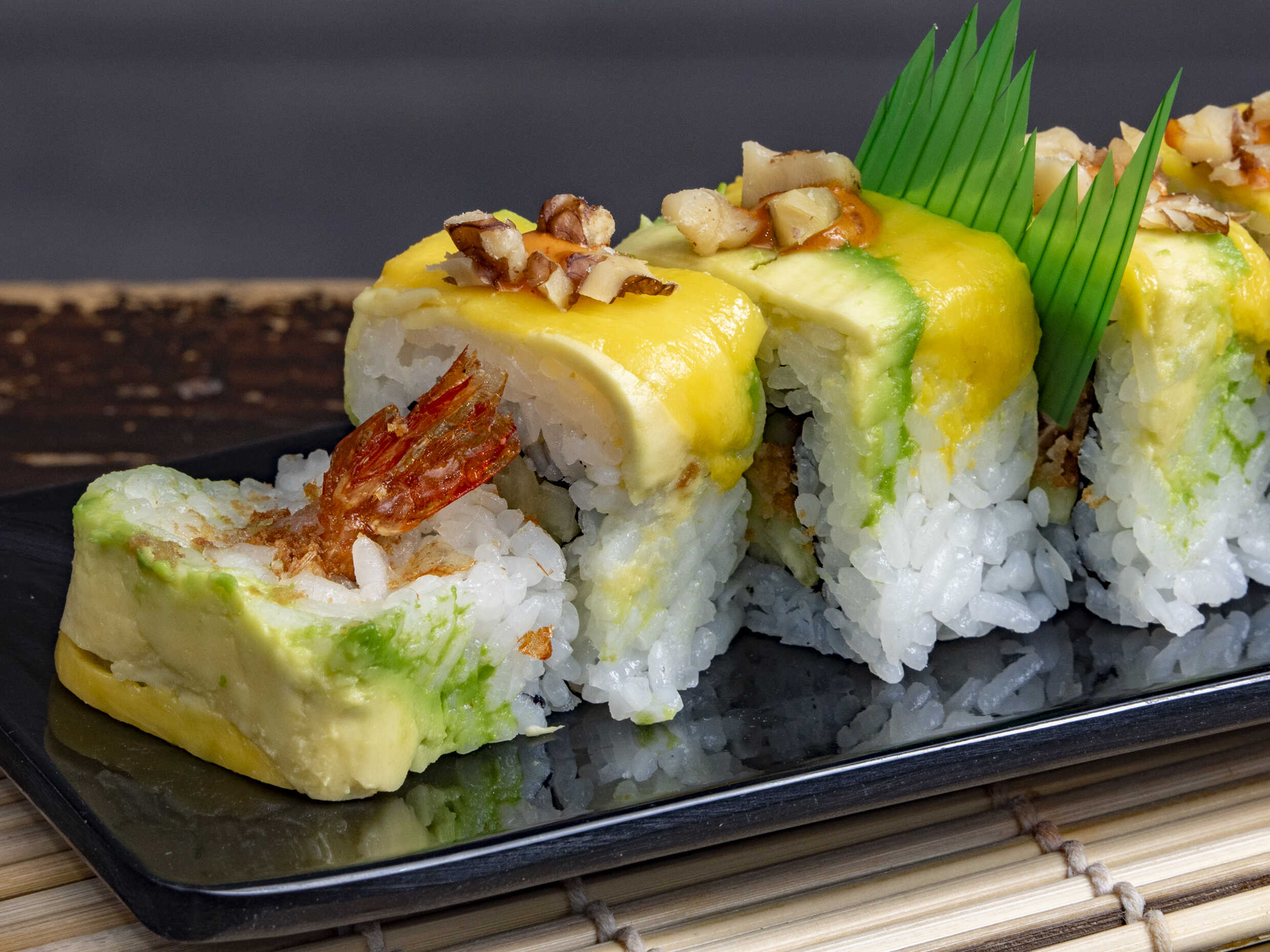Camarón empanizado, queso, envuelto en aguacate con mango y nuez.