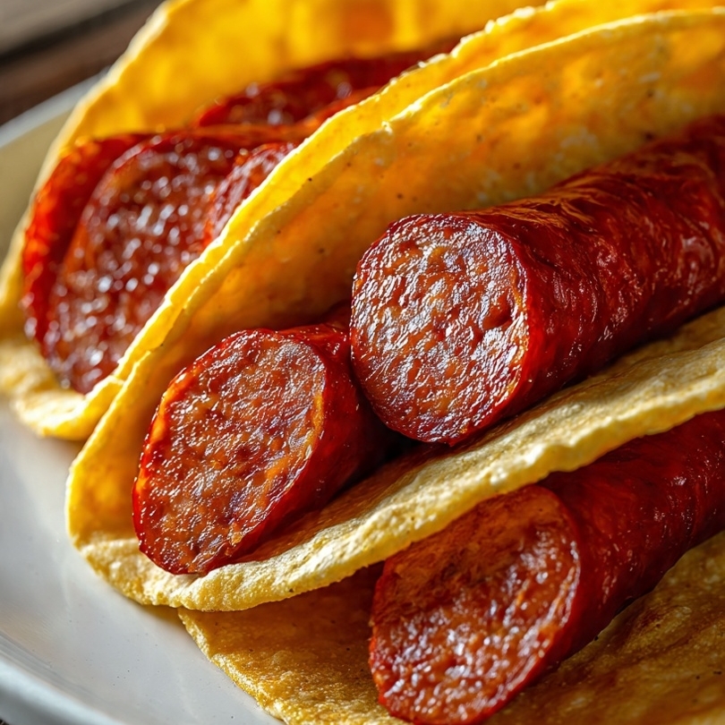 CHISTORRA PREMIUM, DORADA Y CRUJIENTE POR FUERA, JUGOSA Y LLENA DE SABOR POR DENTRO, SERVIDA EN TORTILLA DE MAIZ CALIENTES