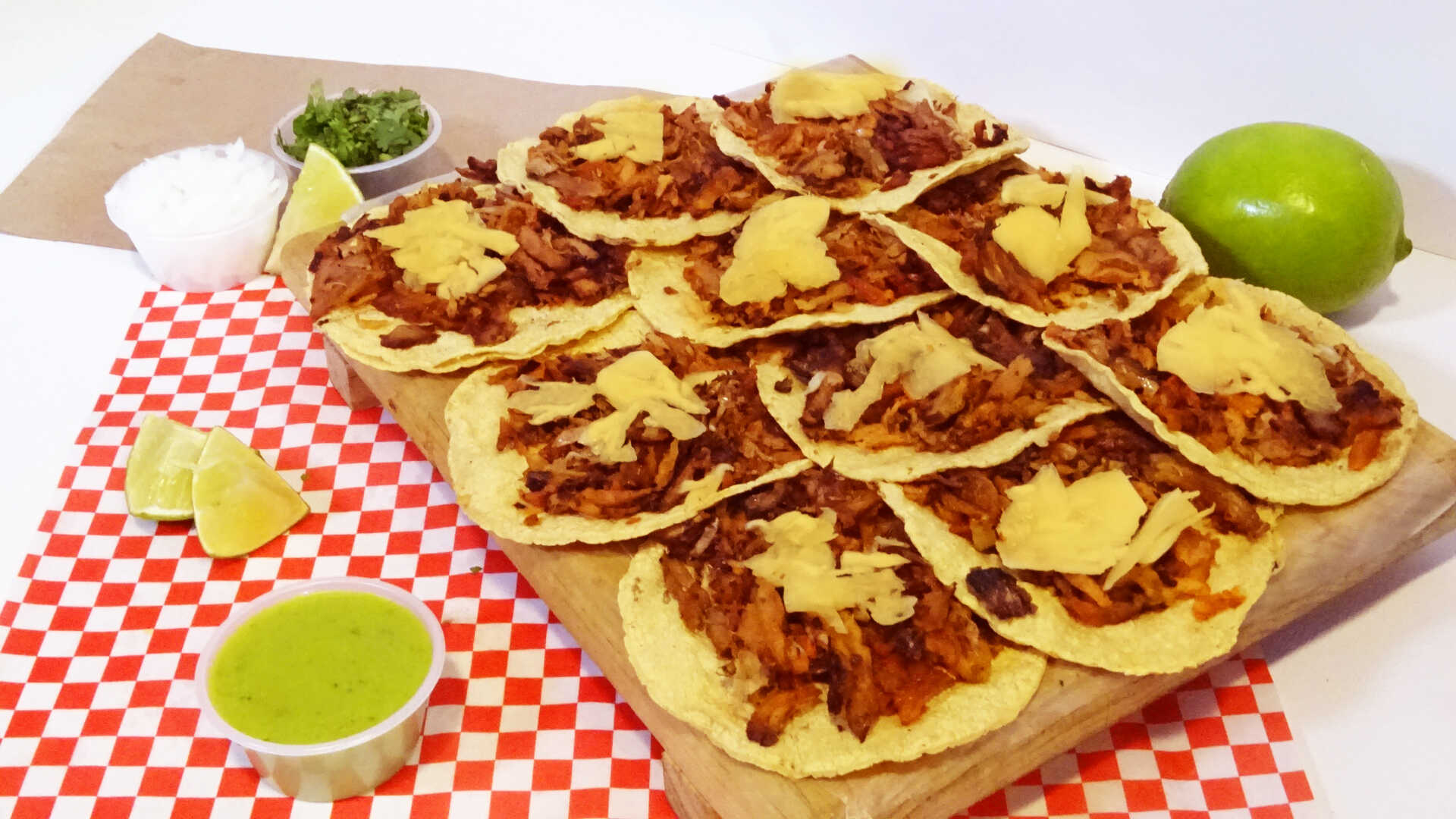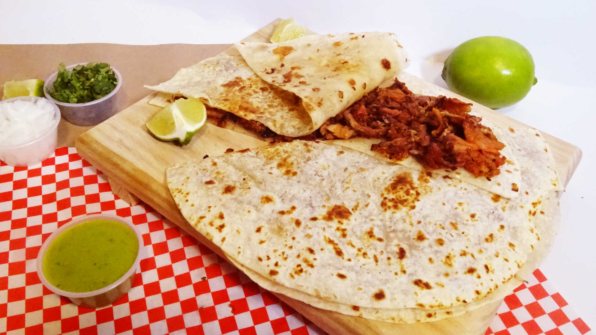 110 g Carne al pastor servida sobre una cama de queso oaxaca fundido en una tortilla de harina