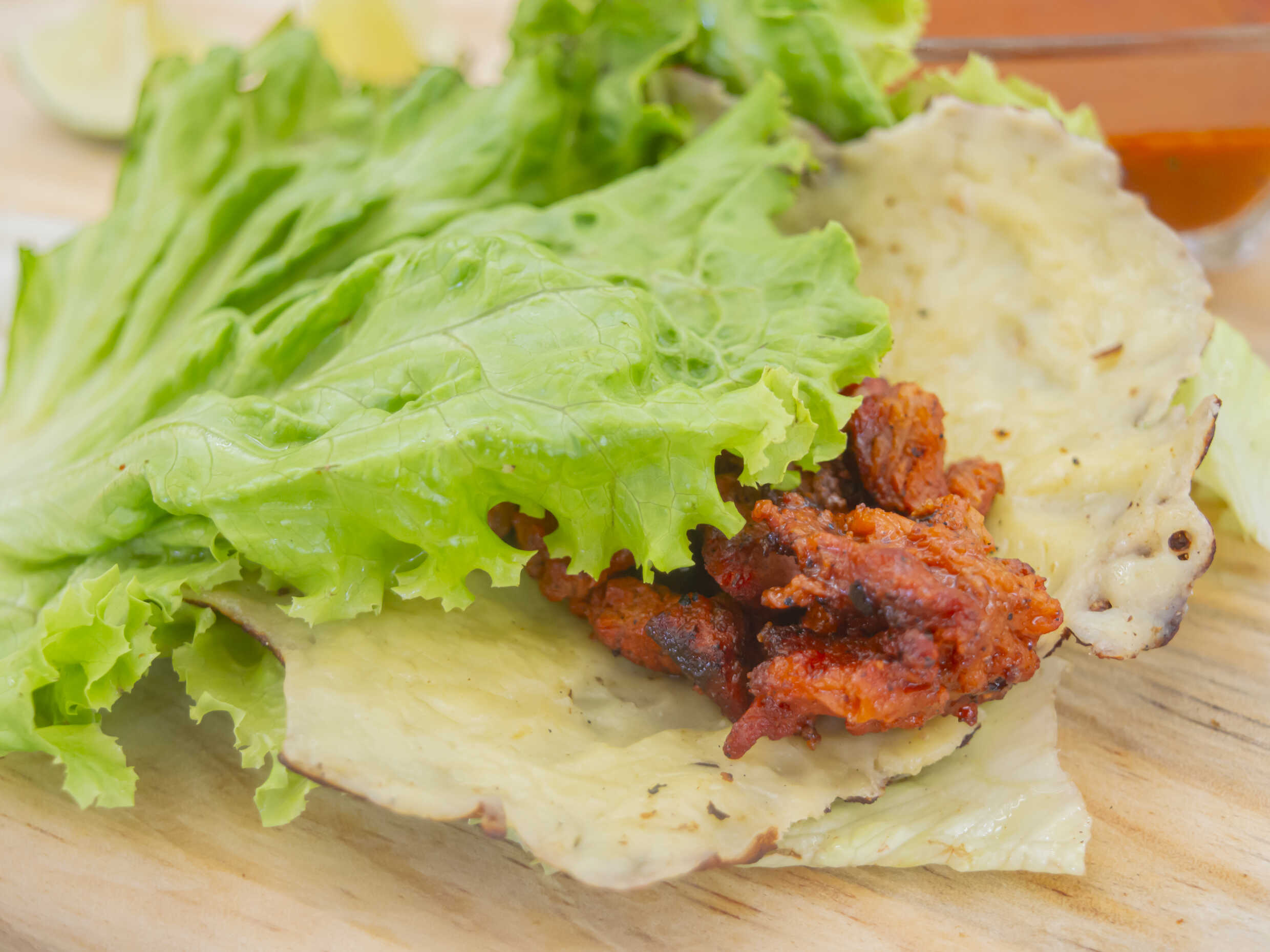 50 g de Arrachera + 60 g de queso Oaxaca dorado a la plancha en una hoja de lechuga por pieza