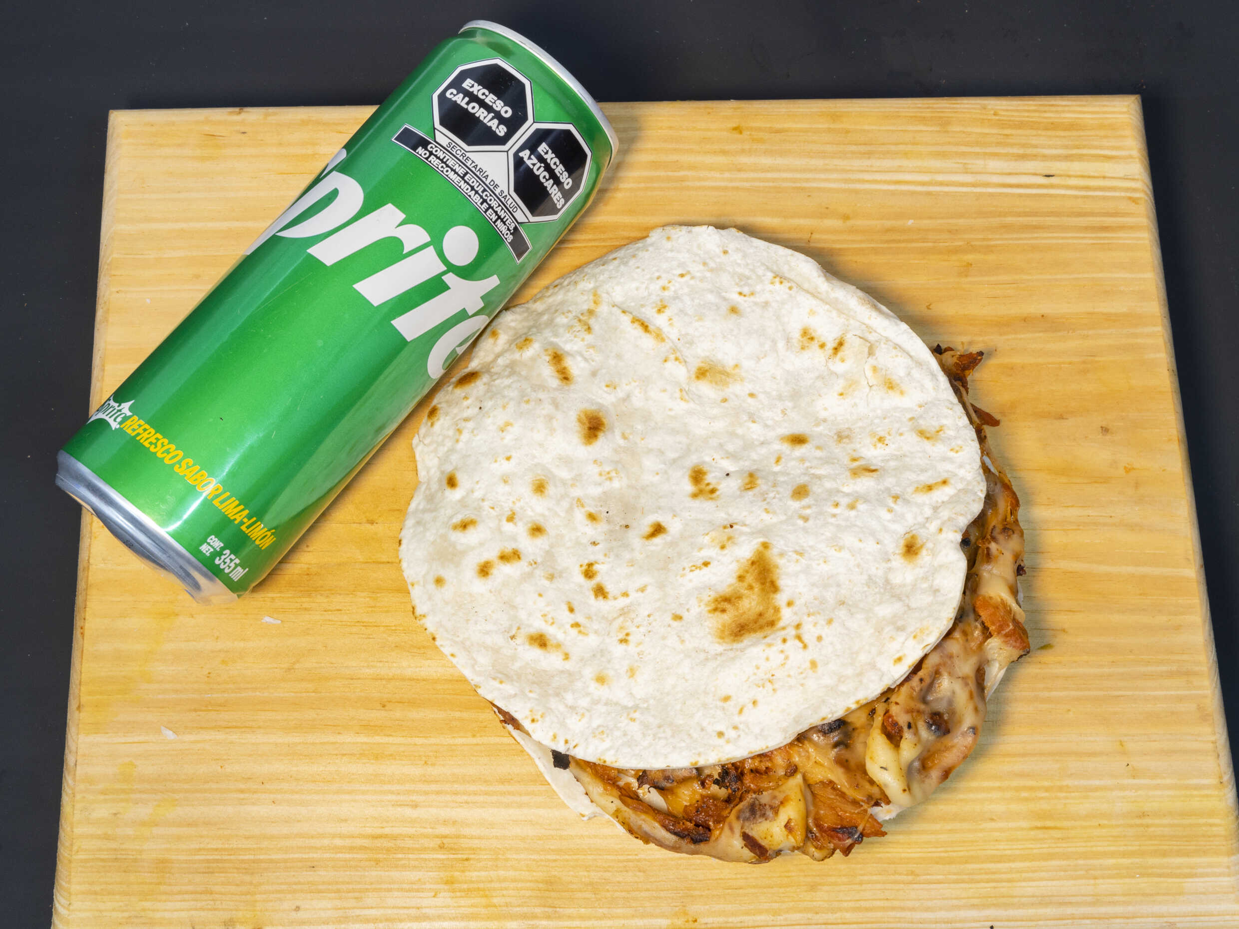 Rica gringa de pastor con un tamaño sobrenatural, ya que esta elaborada sobre una tortilla de harina burrera, acompañada de un refresco de lata