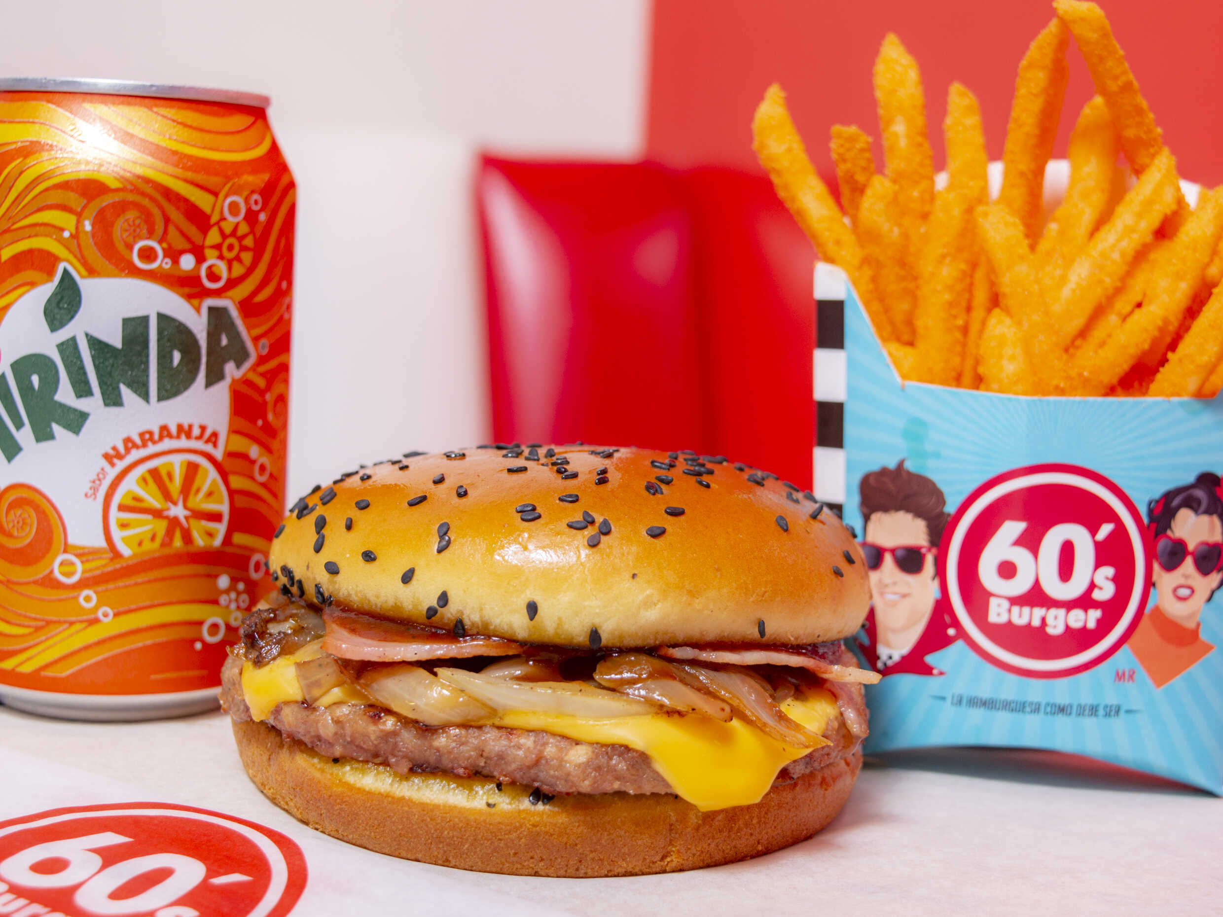 Hamburguesa de Pastor by Sixties Burger, papas a la francesa medianas y refresco de lata 355 ml a elección