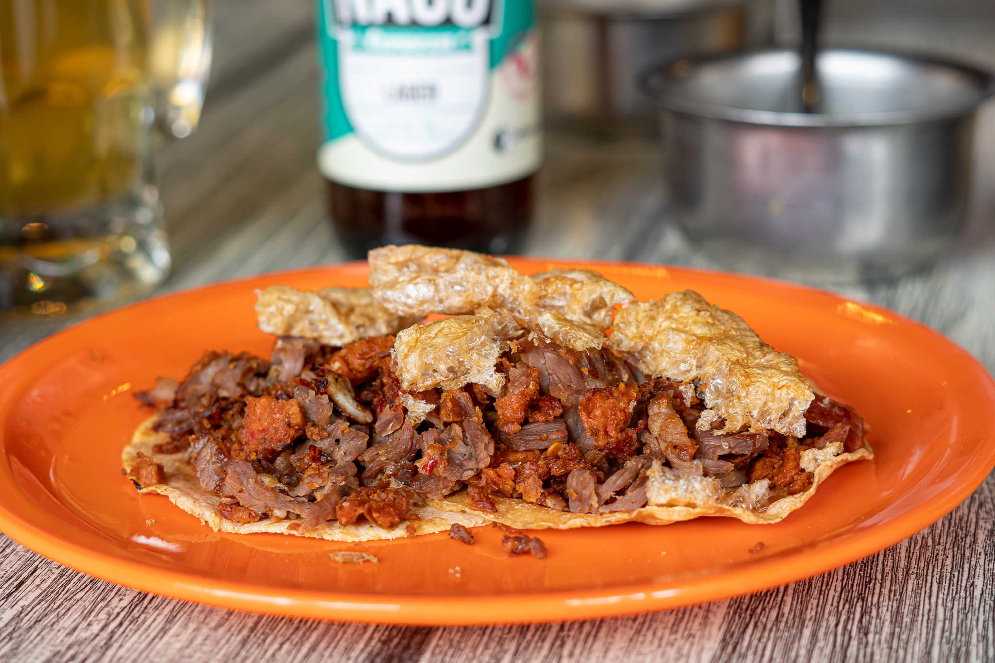 Cecina, longaniza y chicharrón. Un taco de respeto.