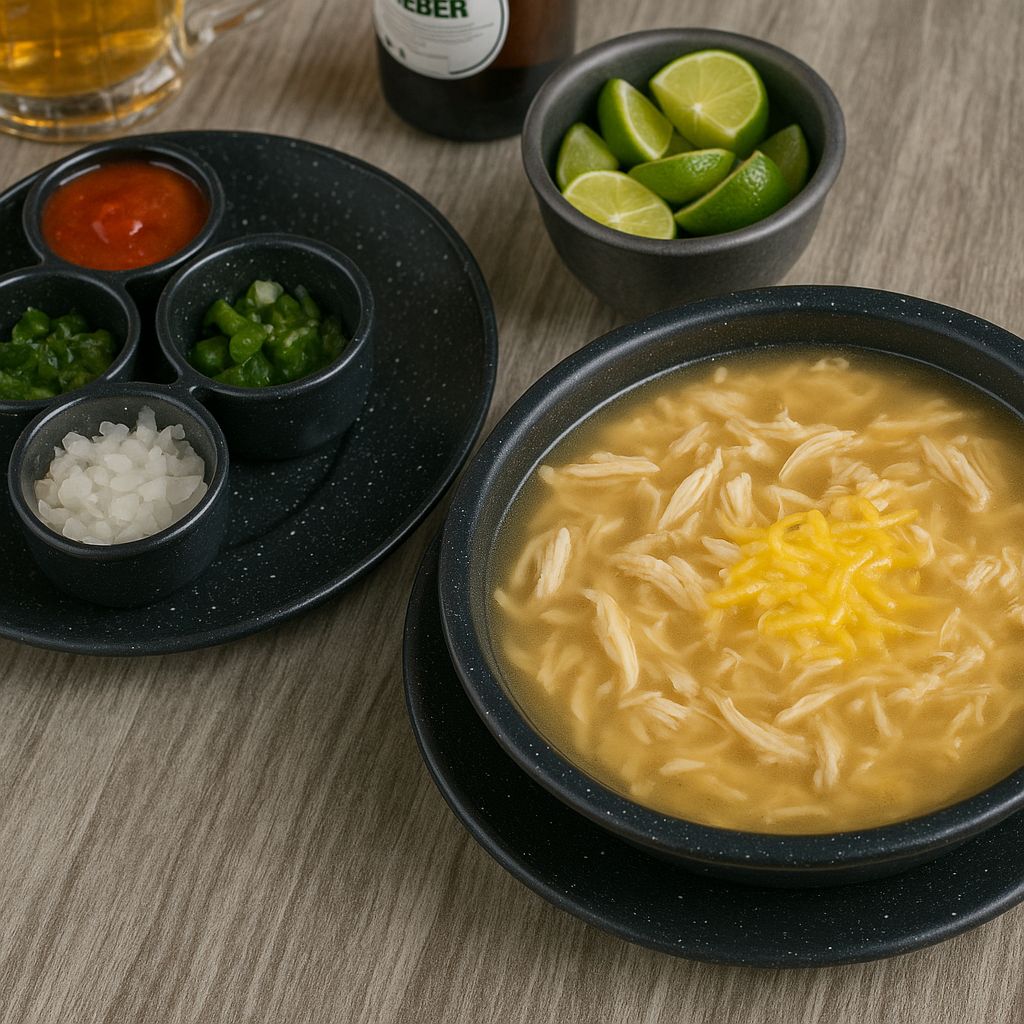Con arroz, cilantro, cebolla, chile jalapeño, aguacate, queso panela y pollo deshebrado. Bien calientito. ( verdura aparte) 250 ml.