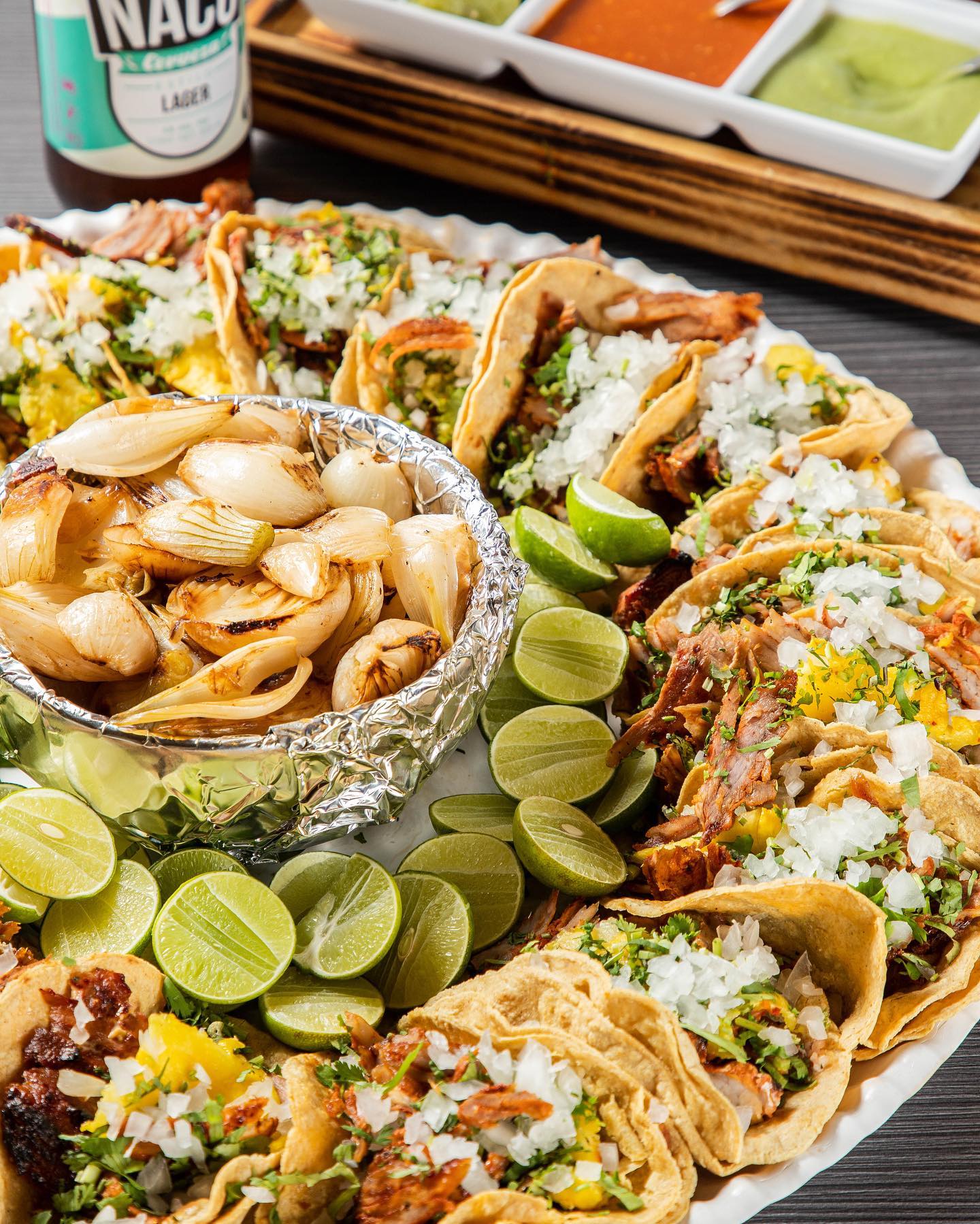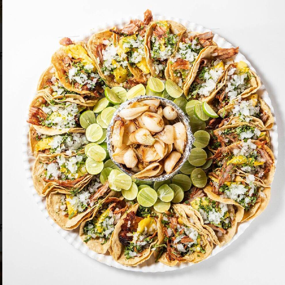 20 tacos de pastor, cebollas cambray, limones y salsa