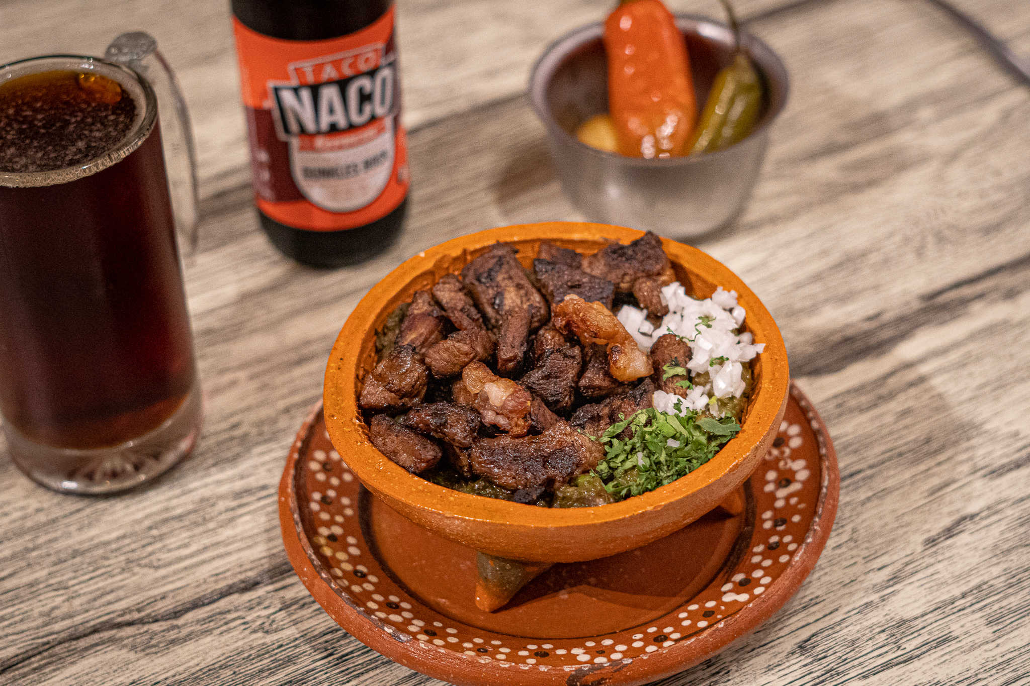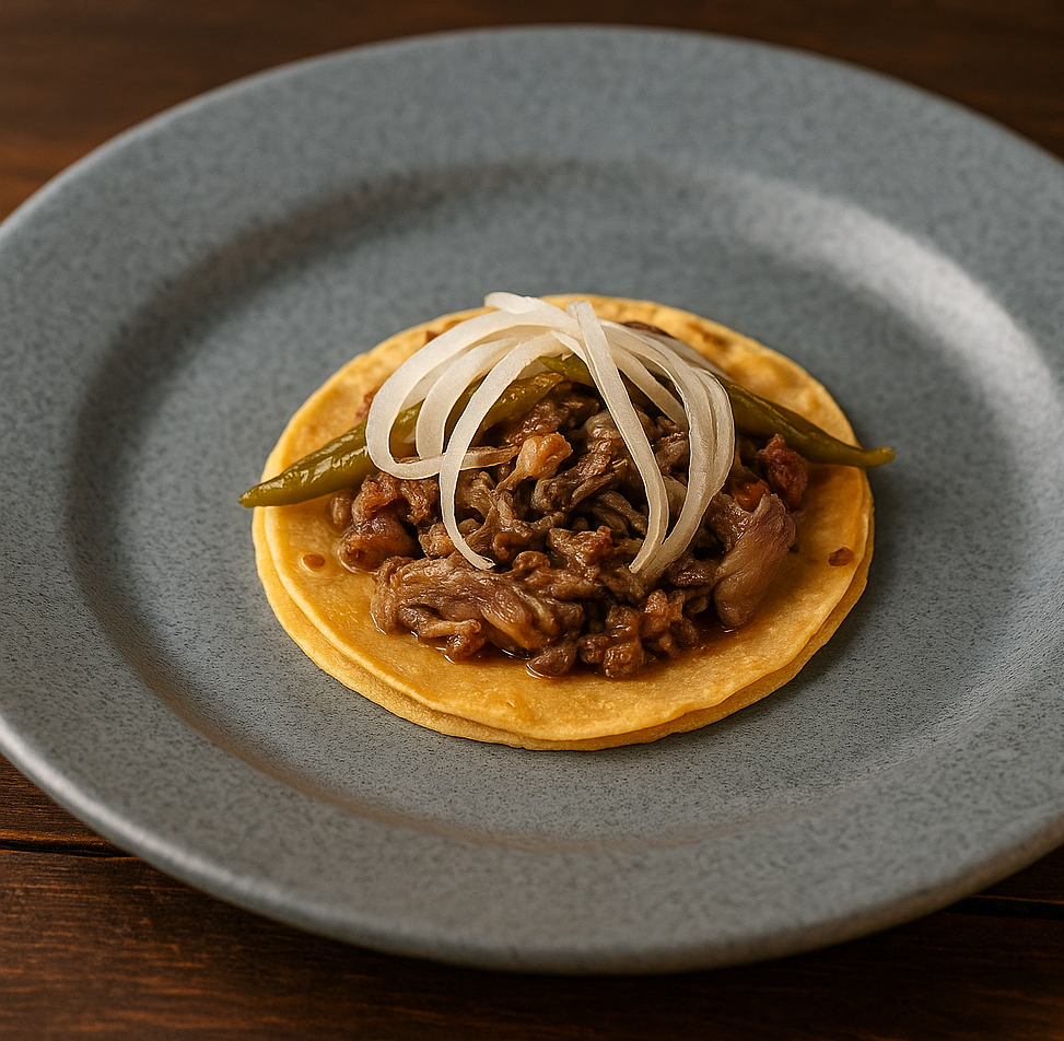 Costilla jugosa con cebolla y nopal en tortilla de maíz.