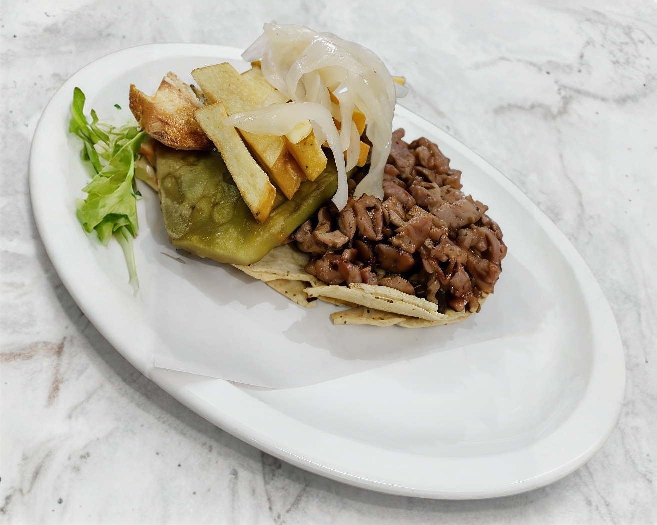 Taco de costilla de res, tortilla tamaño normal, acompañado de papas a la francesa, nopal baby y cebolla cocida.