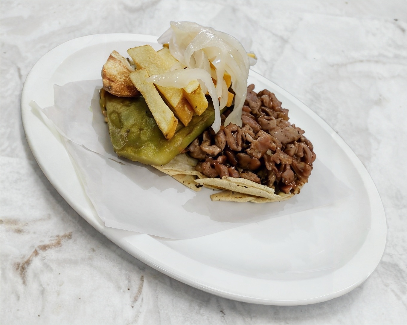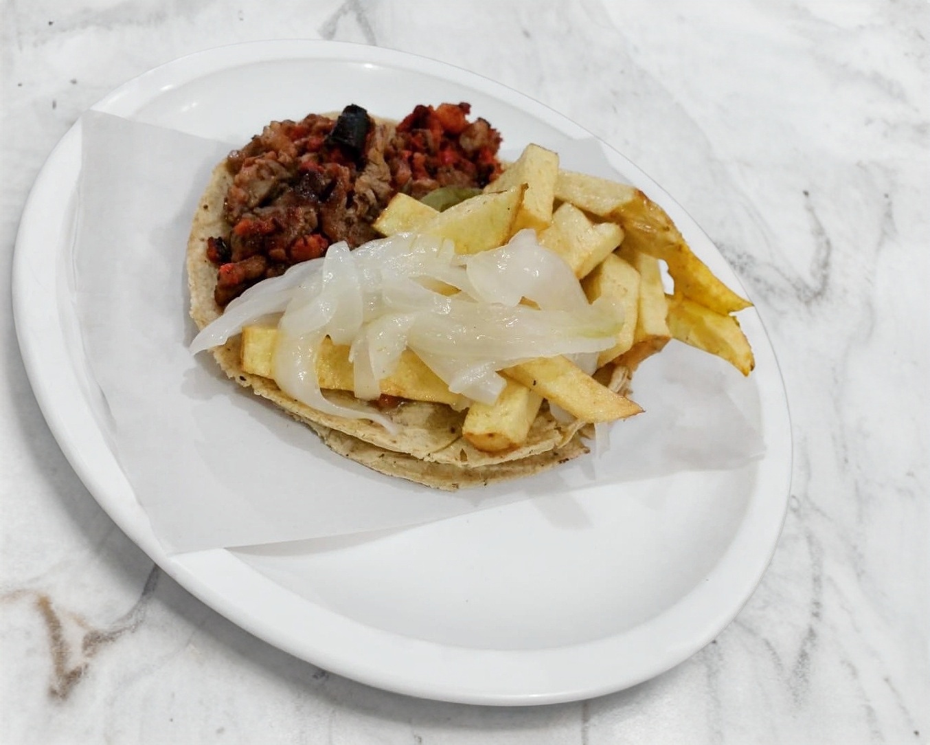 Taco de bistec de res con longaniza, tortilla tamaño normal, acompañado de papas a la francesa nopal baby y cebolla cocida.
