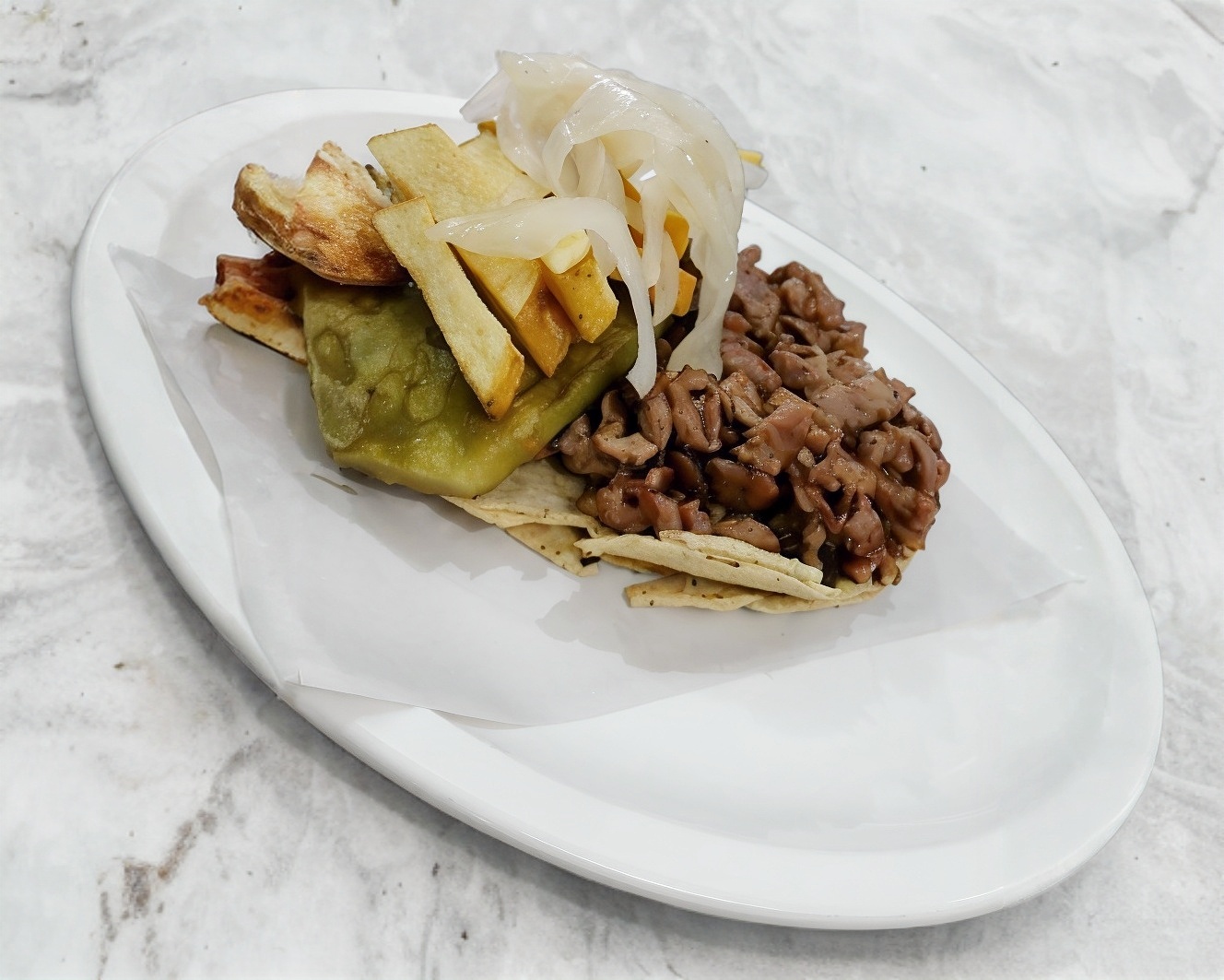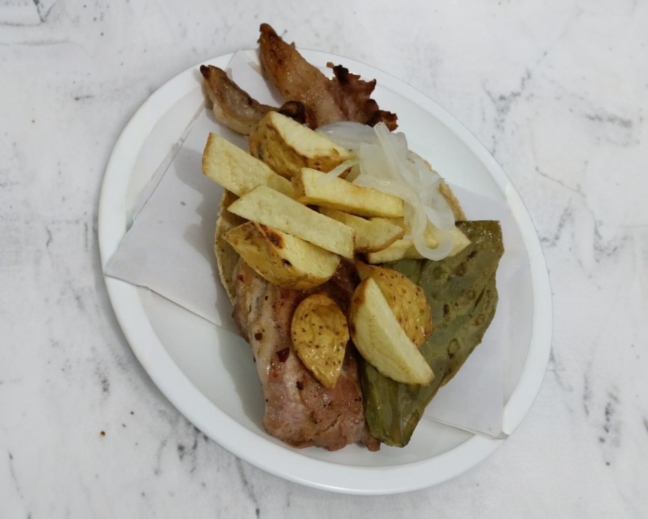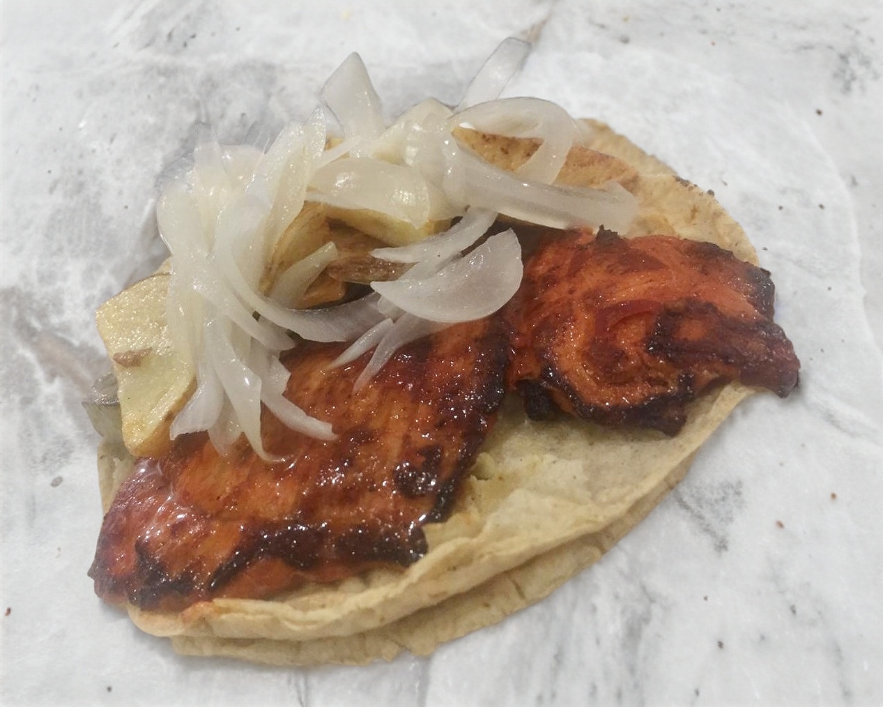 Taco de carne enchilada de cerdo, tortilla tamaño normal, acompañado de papas a la francesa nopal baby y cebolla cocida.