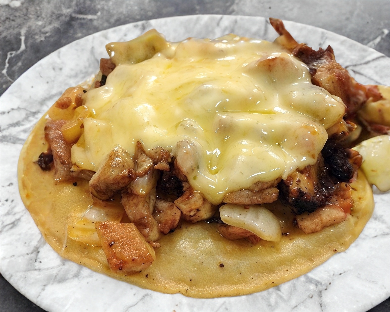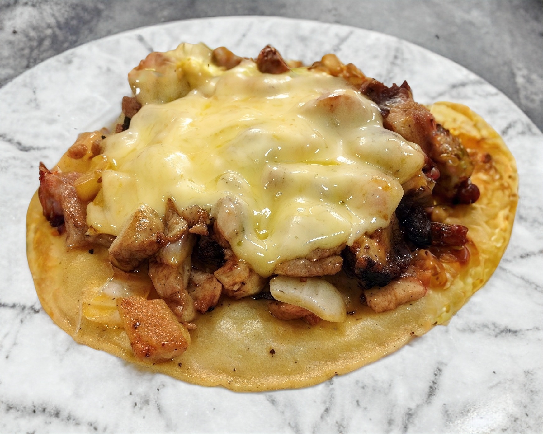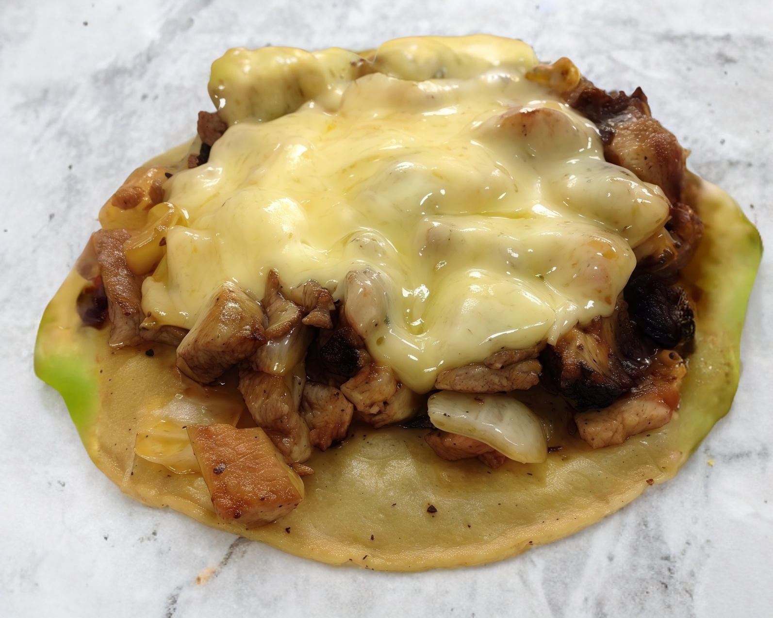 2 tortillas de harina, carne de enchilada de cerdo, queso oaxaca.