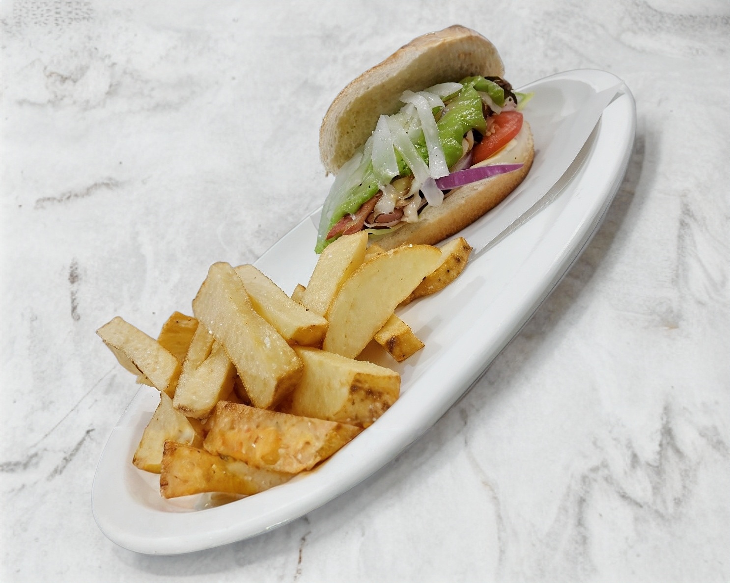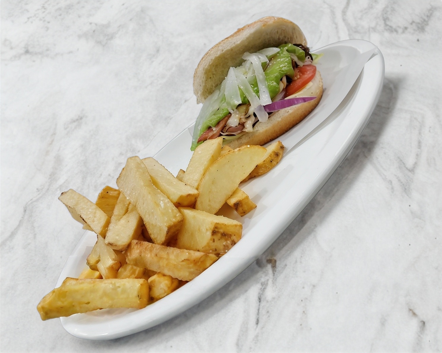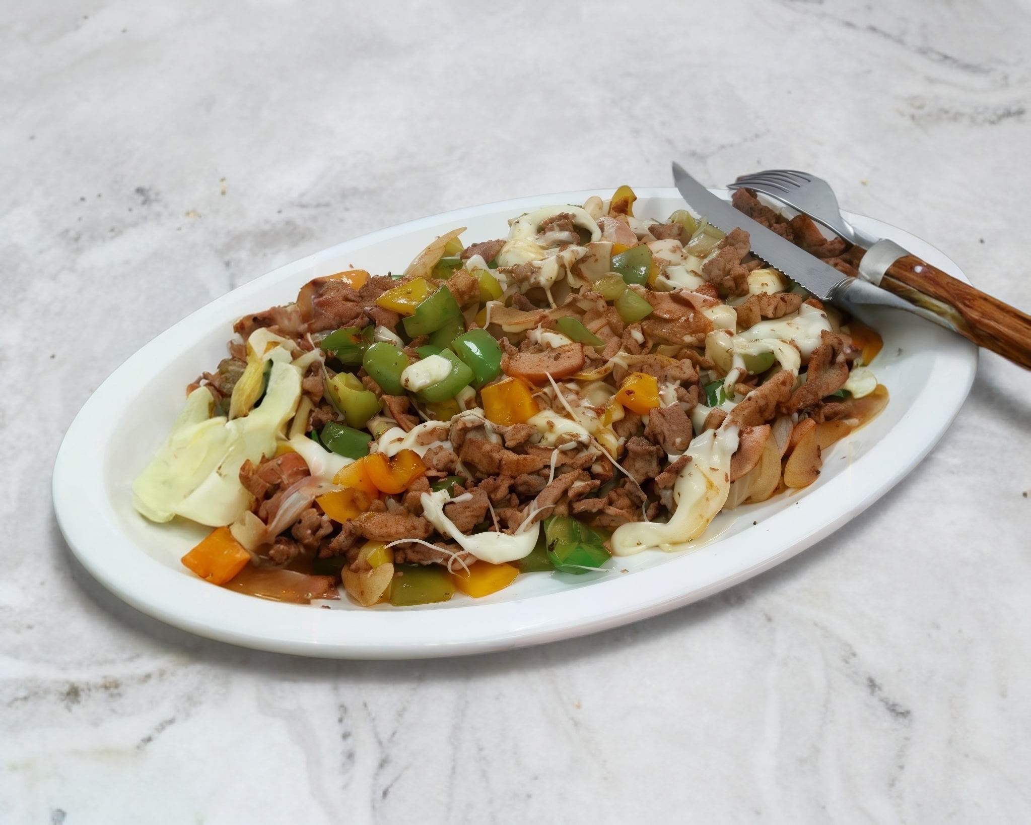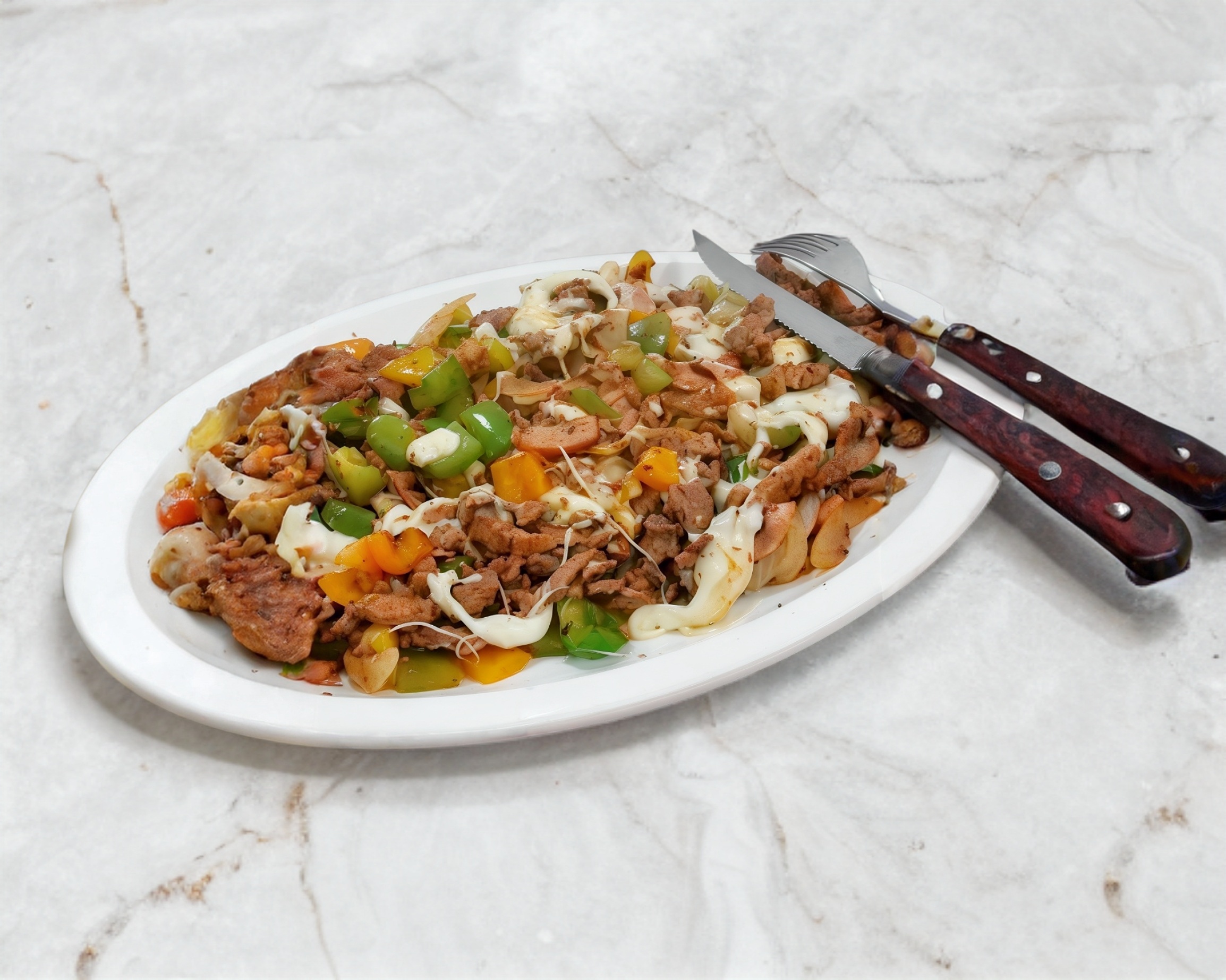 Carne de res, chorizo, tocino, quesillo, lechuga, jitomate, cebolla, picante y papas a la francesa.
