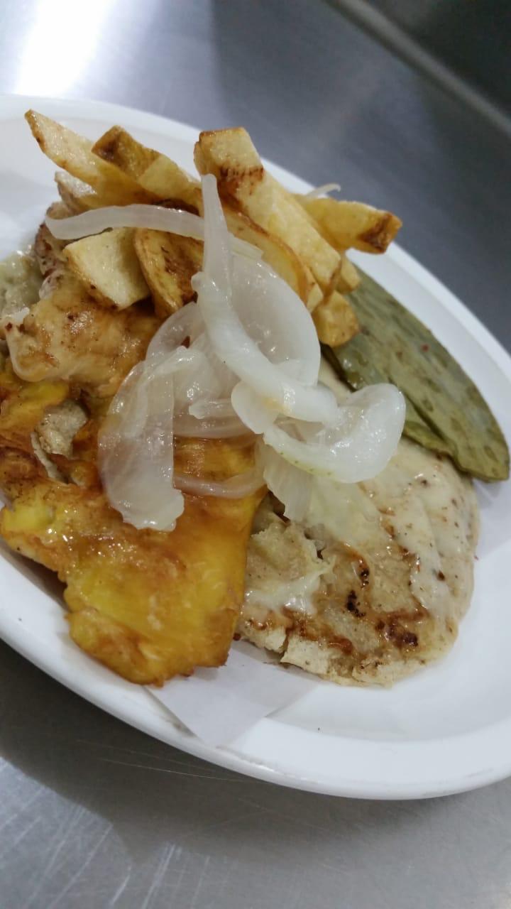 Taco de pechuga de res, tortilla tamaño normal, acompañado de papas a la francesa nopal baby y cebolla cocida.