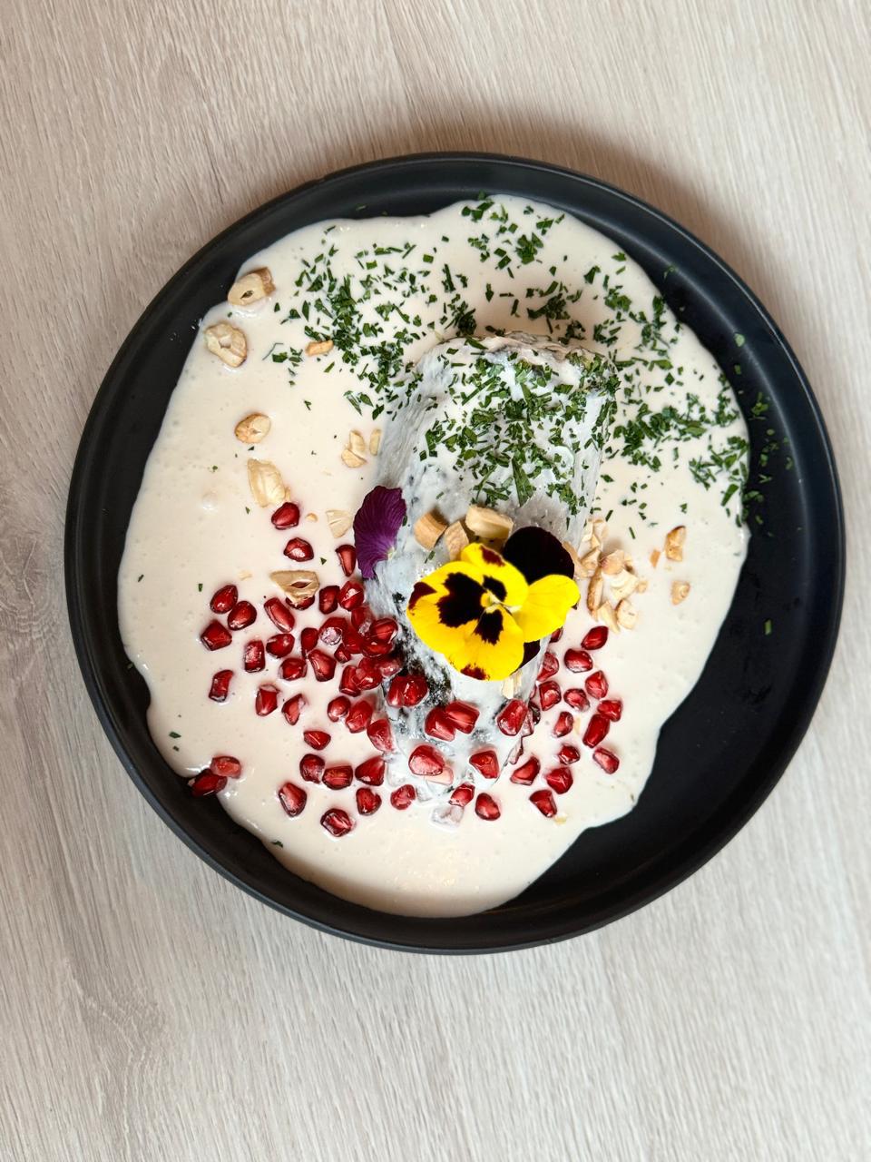 Chile relleno de camarón, pescado y pulpo, con nogada , granda y nuez de castilla.
