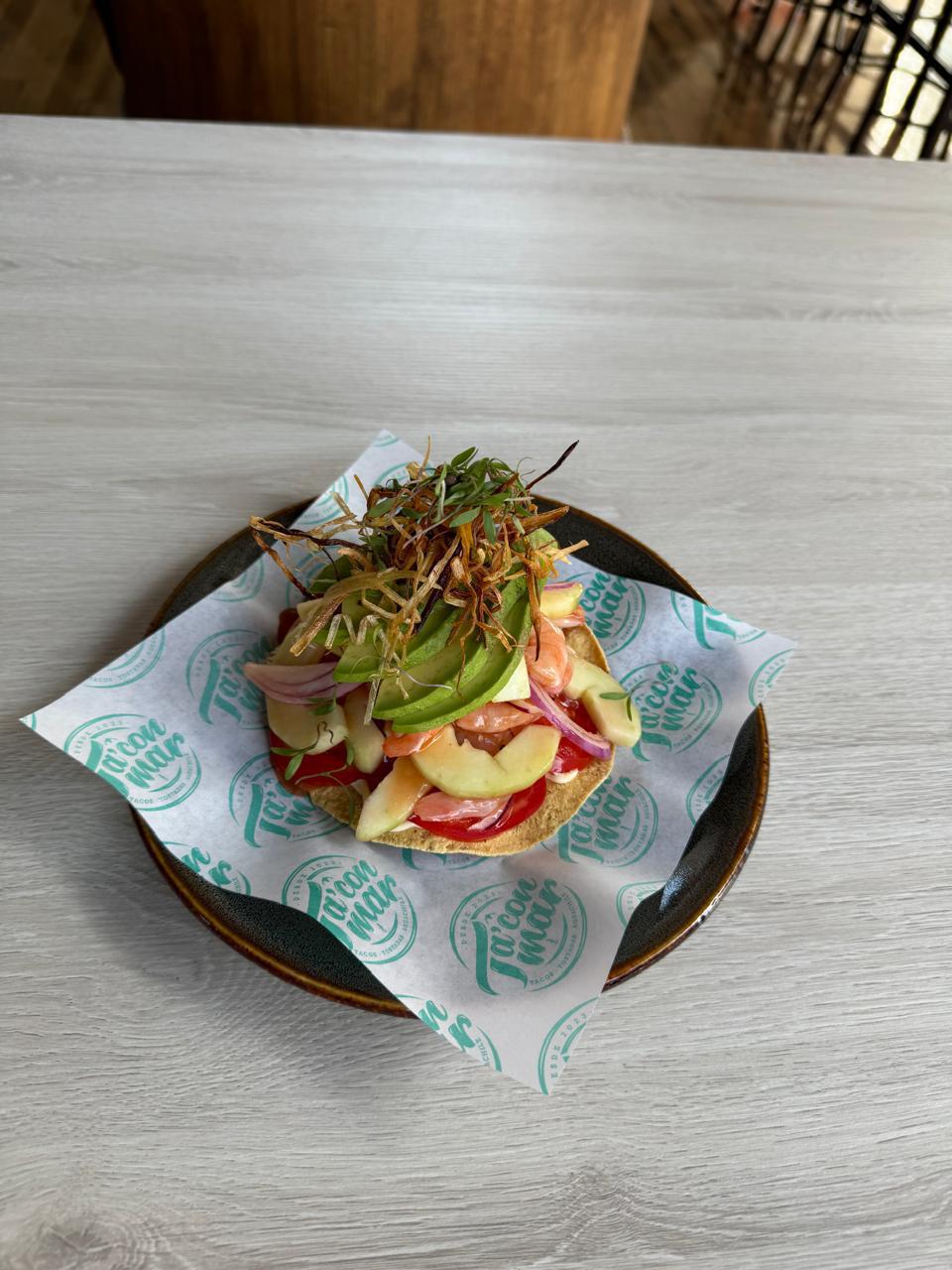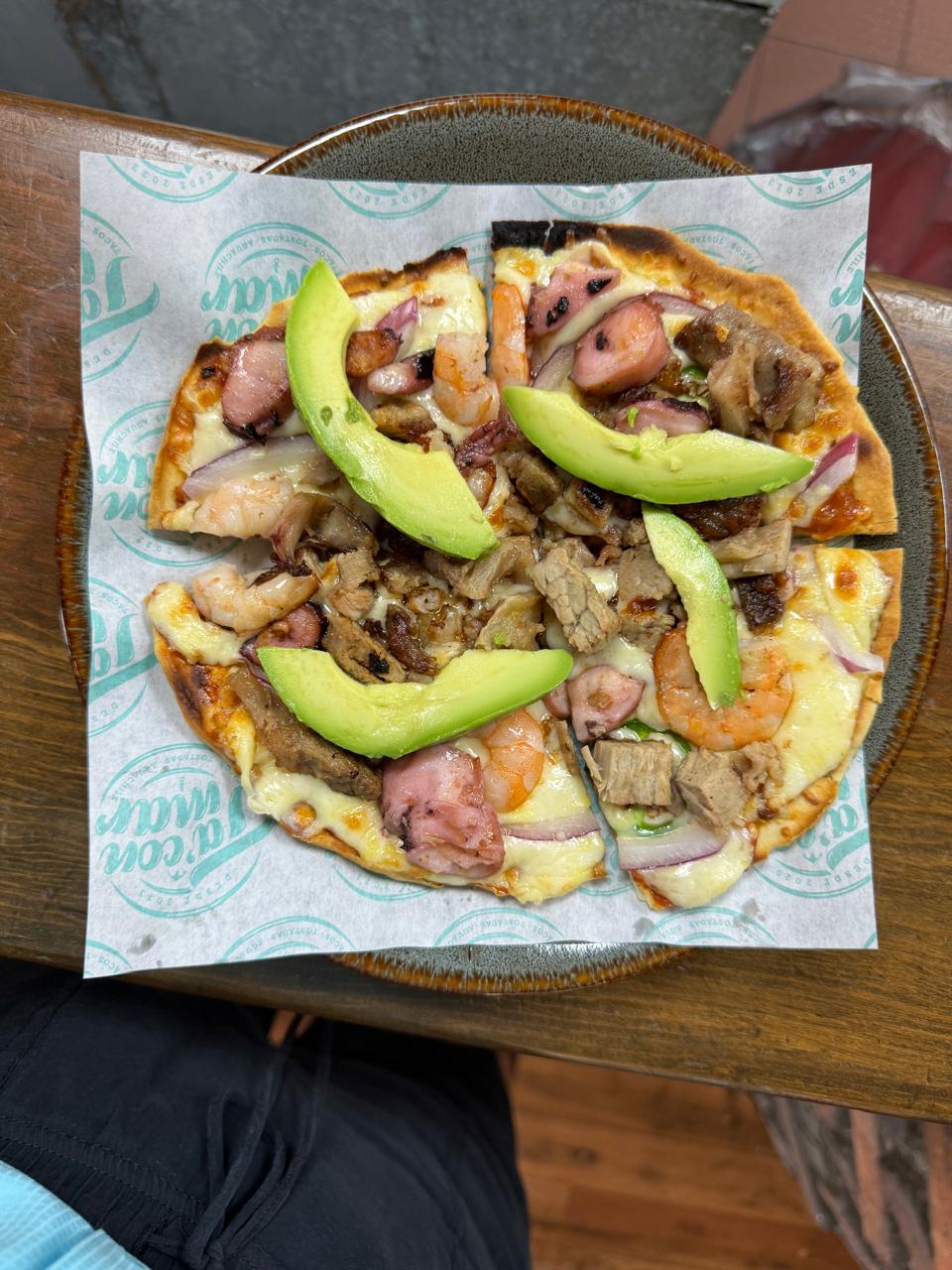 Pomodoro, queso, suadero, cara pulpo, camarón, jalapeño cebolla morada y aguacate.