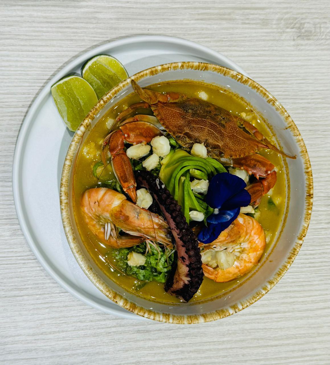 Delicioso pozole de mariscos con camarón, pulpo y jaiba.